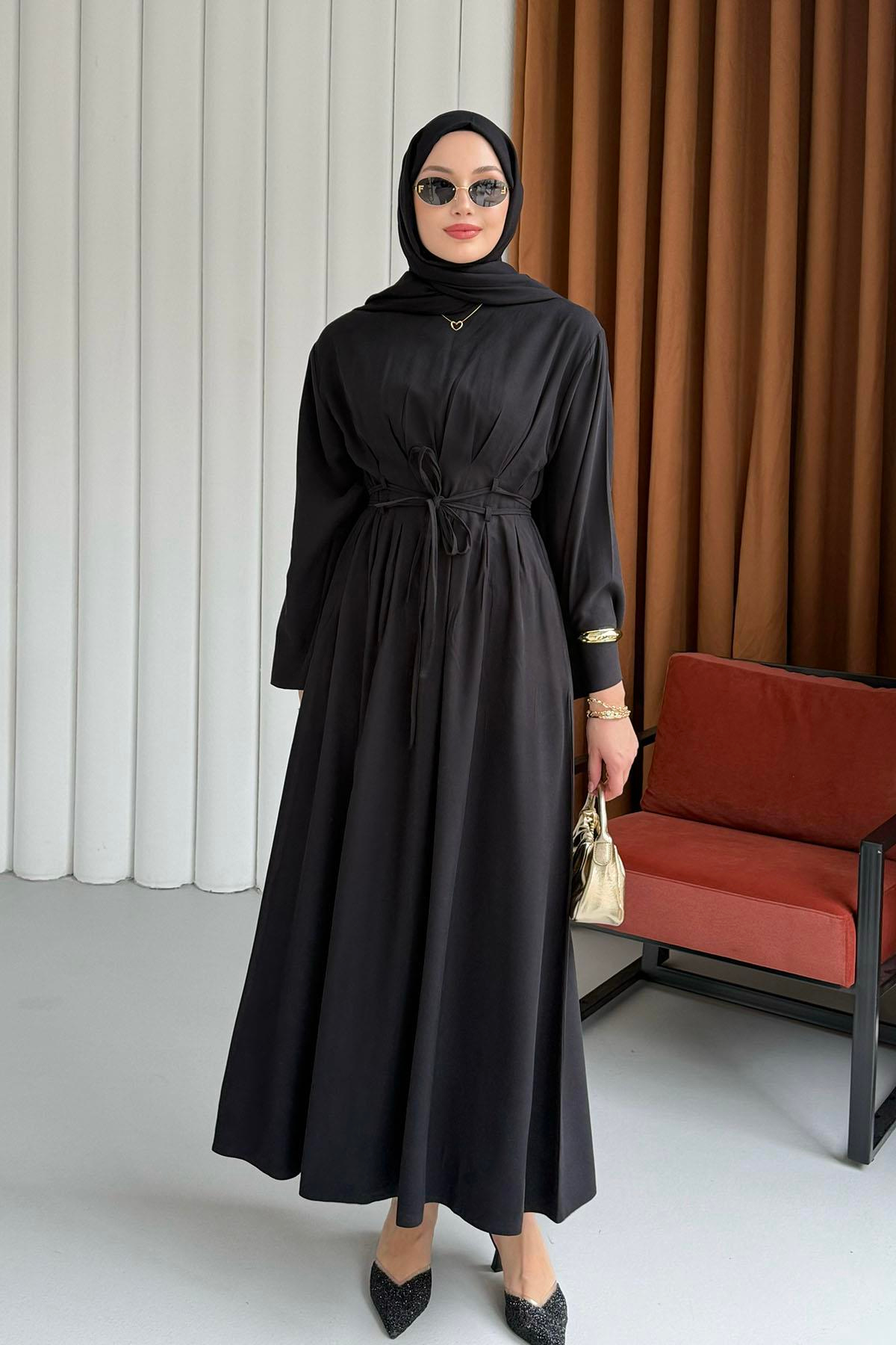 Belden Oturtmalı Çift Kemer Geçişli Tesettür Elbise-SİYAH (25120)