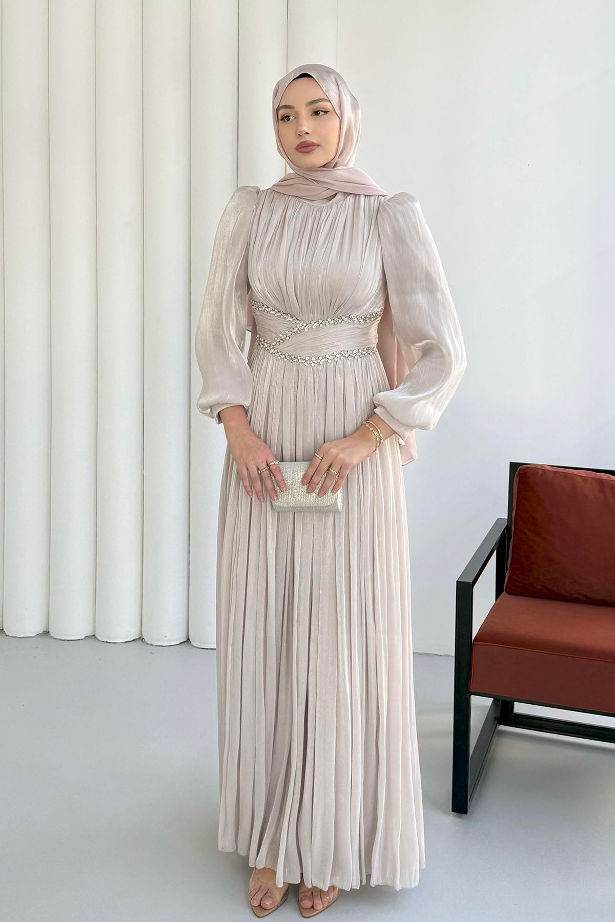 Belden Oturtmalı Taş İşlemeli Jan Jan Tesettür Abiye-TAŞ (5404)
