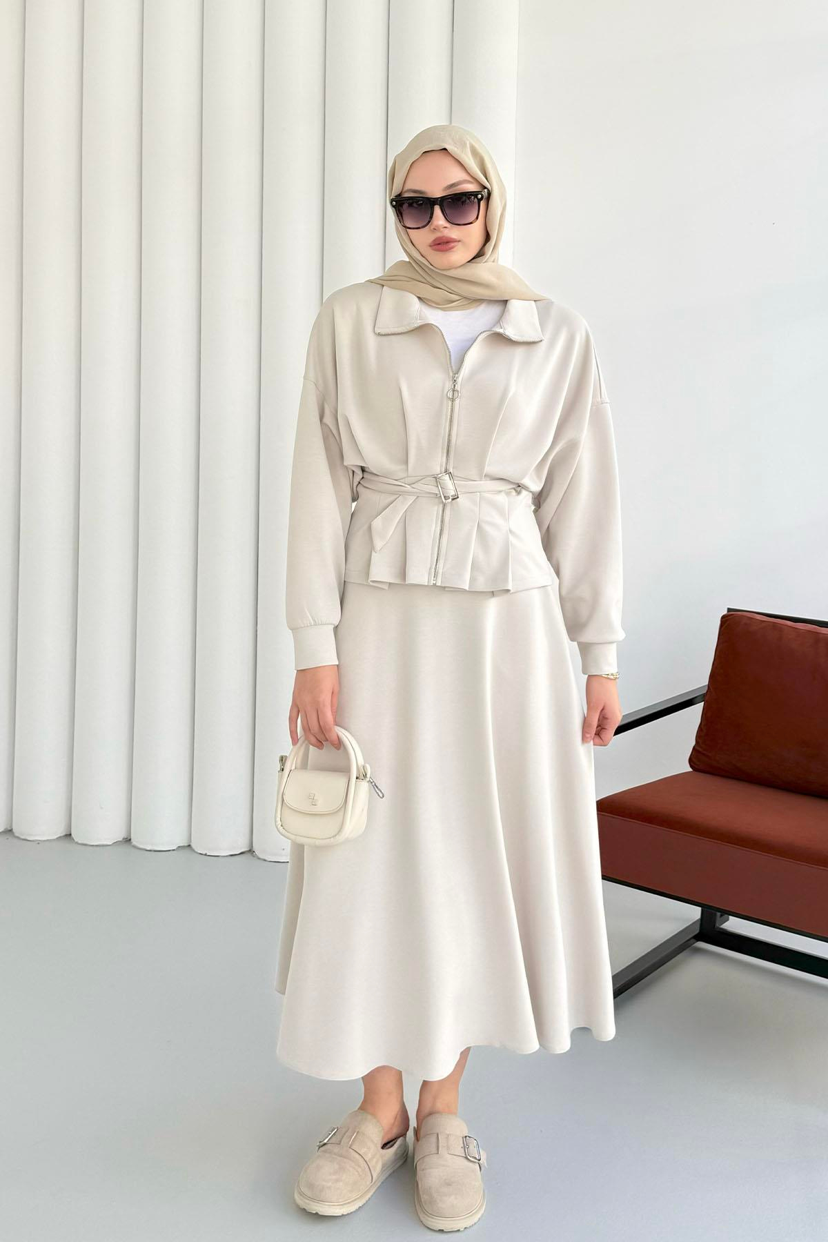 Beli Bağlamalı Fermuarlı Etekli Tesettür Takım-BEJ (8408)