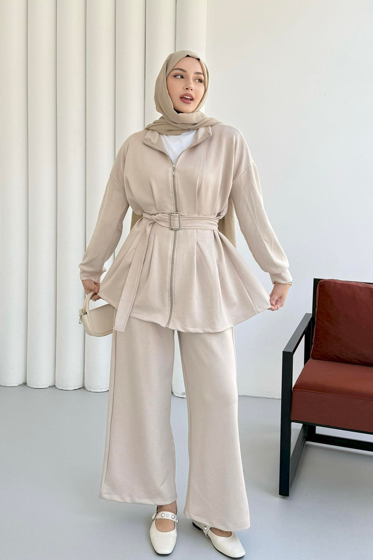 Beli Pileli Fermuarlı Oysho Kumaş Tesettür Takım-TAŞ (22772)