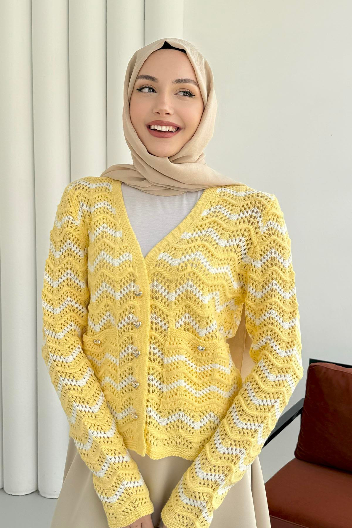 Beyaz Zikzak Desenli Triko Hıkra-SARI (26710)