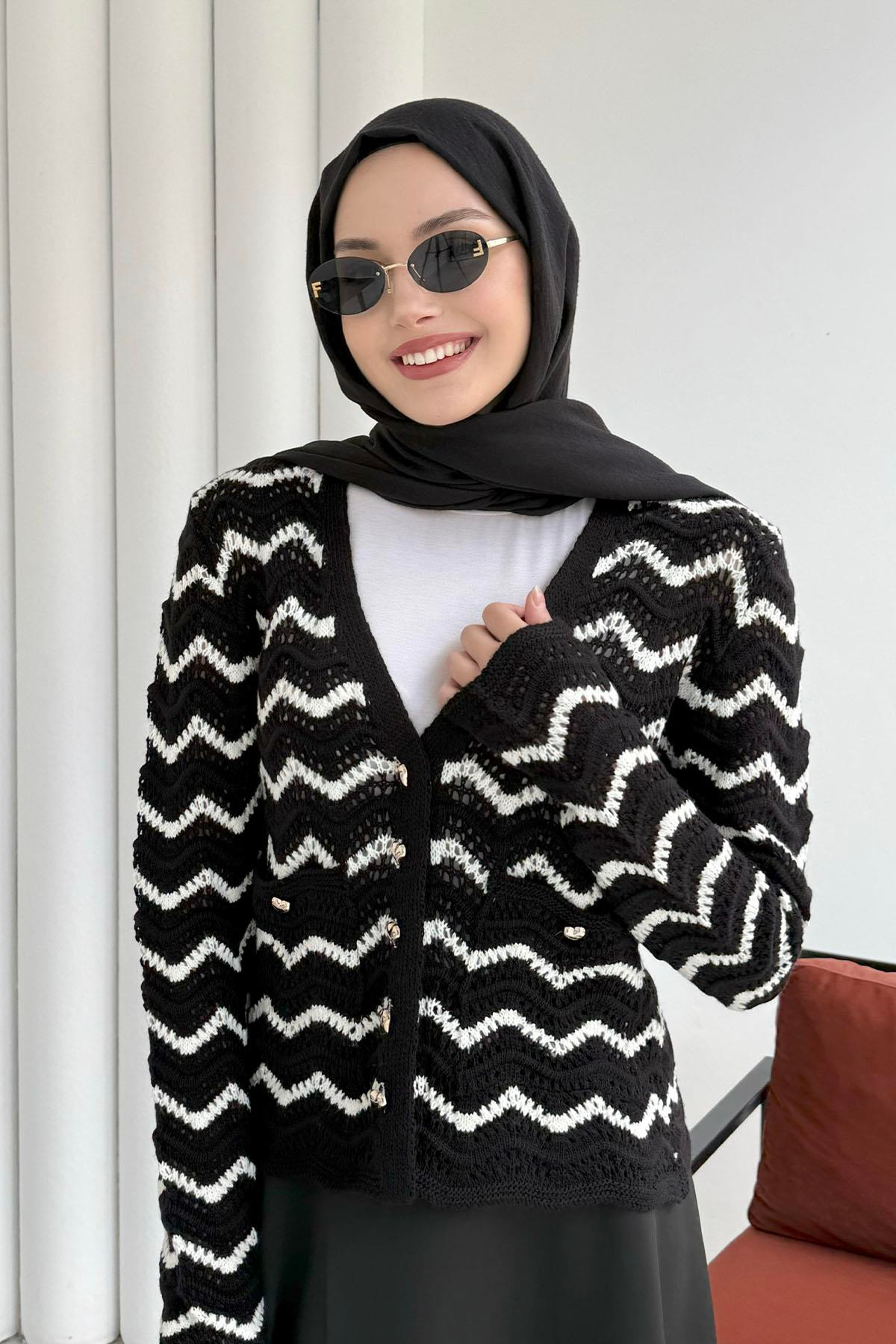 Beyaz Zikzak Desenli Triko Hıkra-SİYAH (26710)