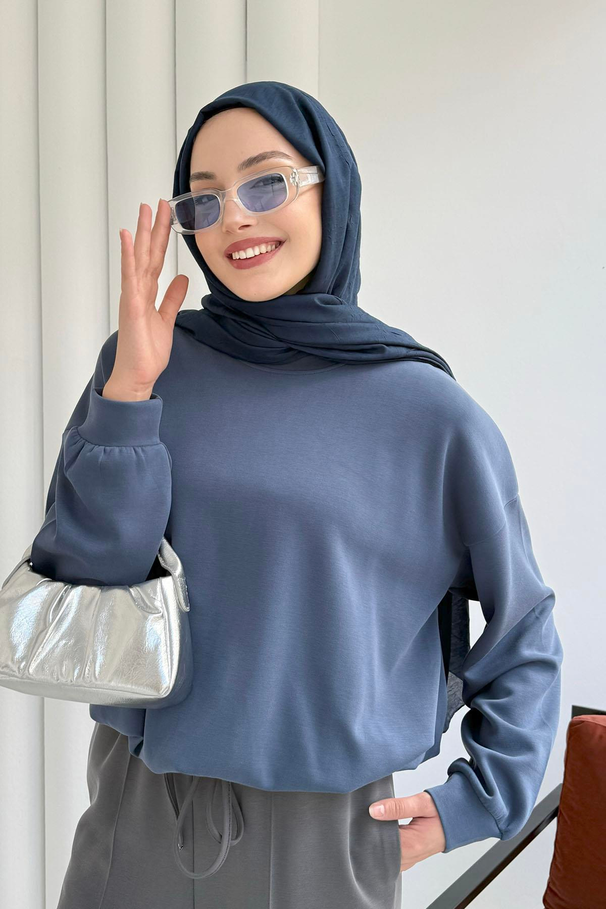 Bisiklet Yaka Oversize Sweatshirt-İNDİGO (30008)