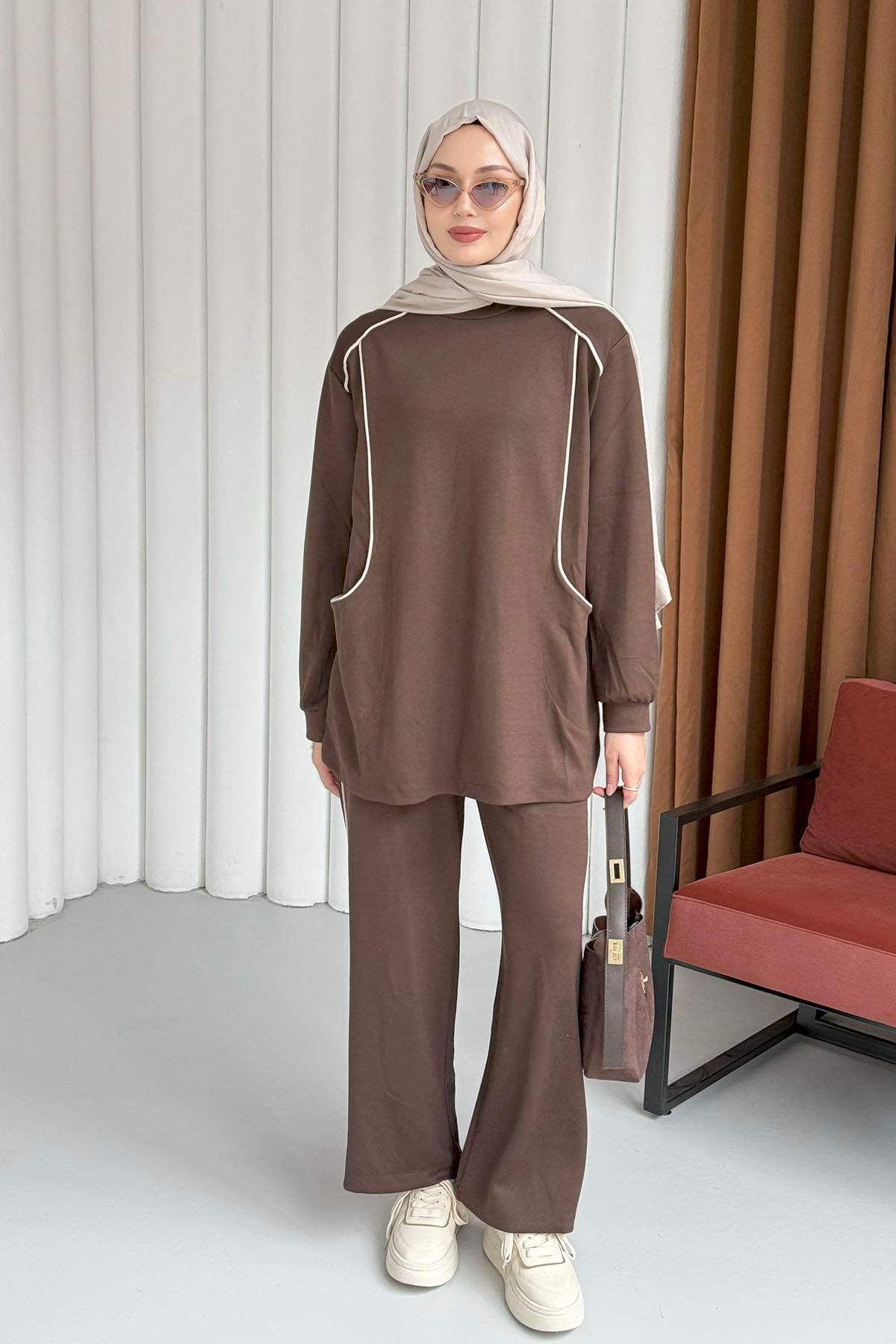 Biye Detaylı Kanguru Cepli Tesettür Takım-KAHVERENGİ (22778)