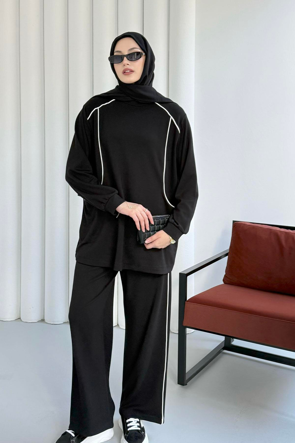 Biye Detaylı Kanguru Cepli Tesettür Takım-SİYAH (22778)