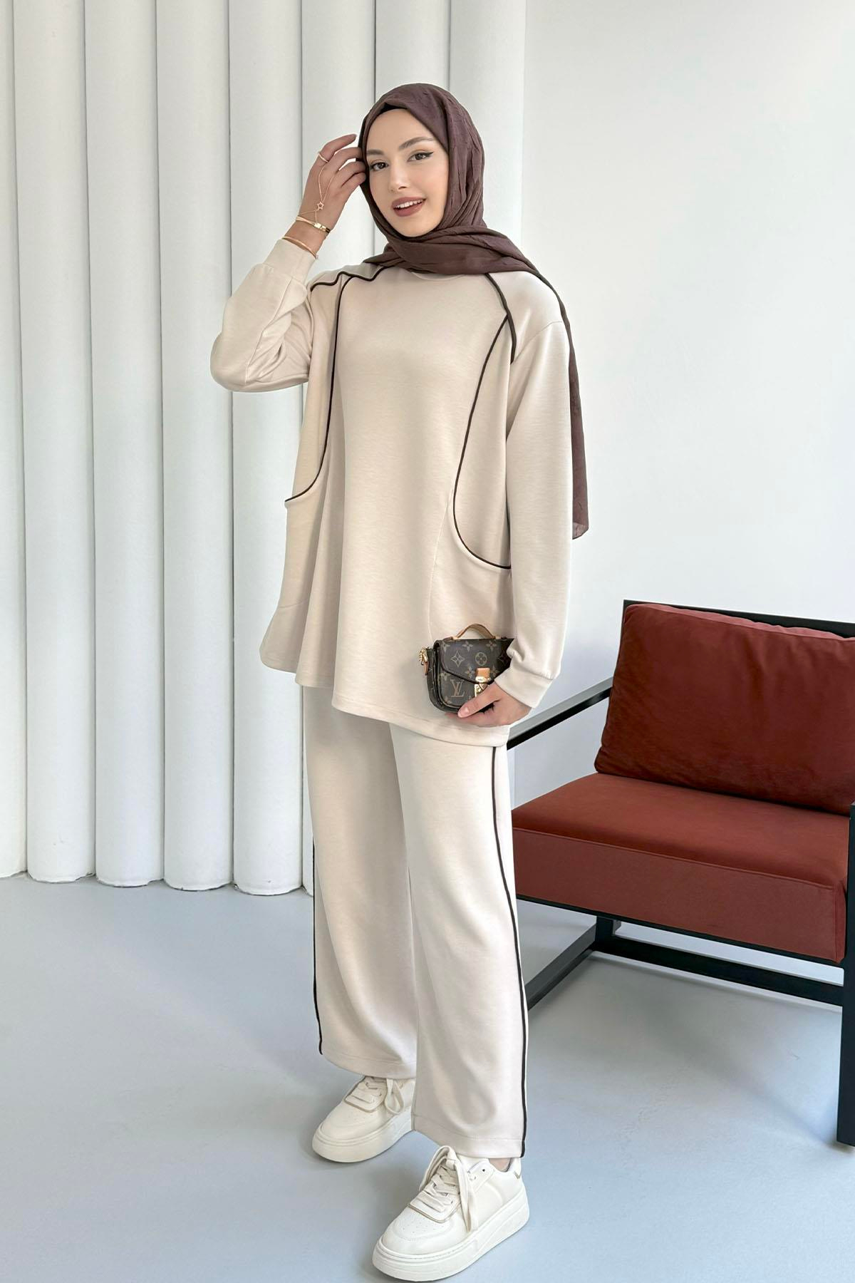 Biye Detaylı Kanguru Cepli Tesettür Takım-TAŞ (22778)