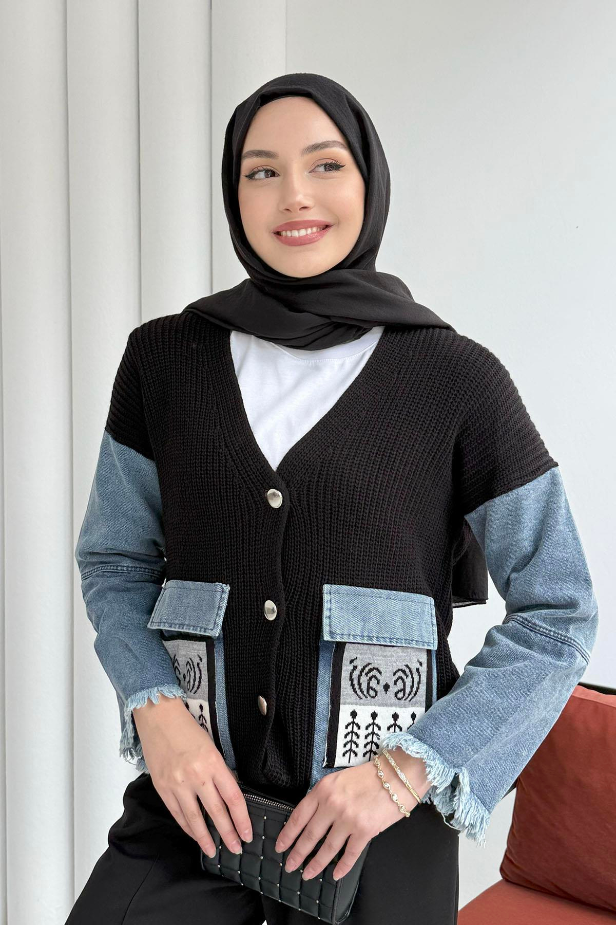 Cepler Desenli Kot Detaylı Triko Hırka-TAŞ Cepler Desenli Kot Detaylı Triko Hırka-SİYAH