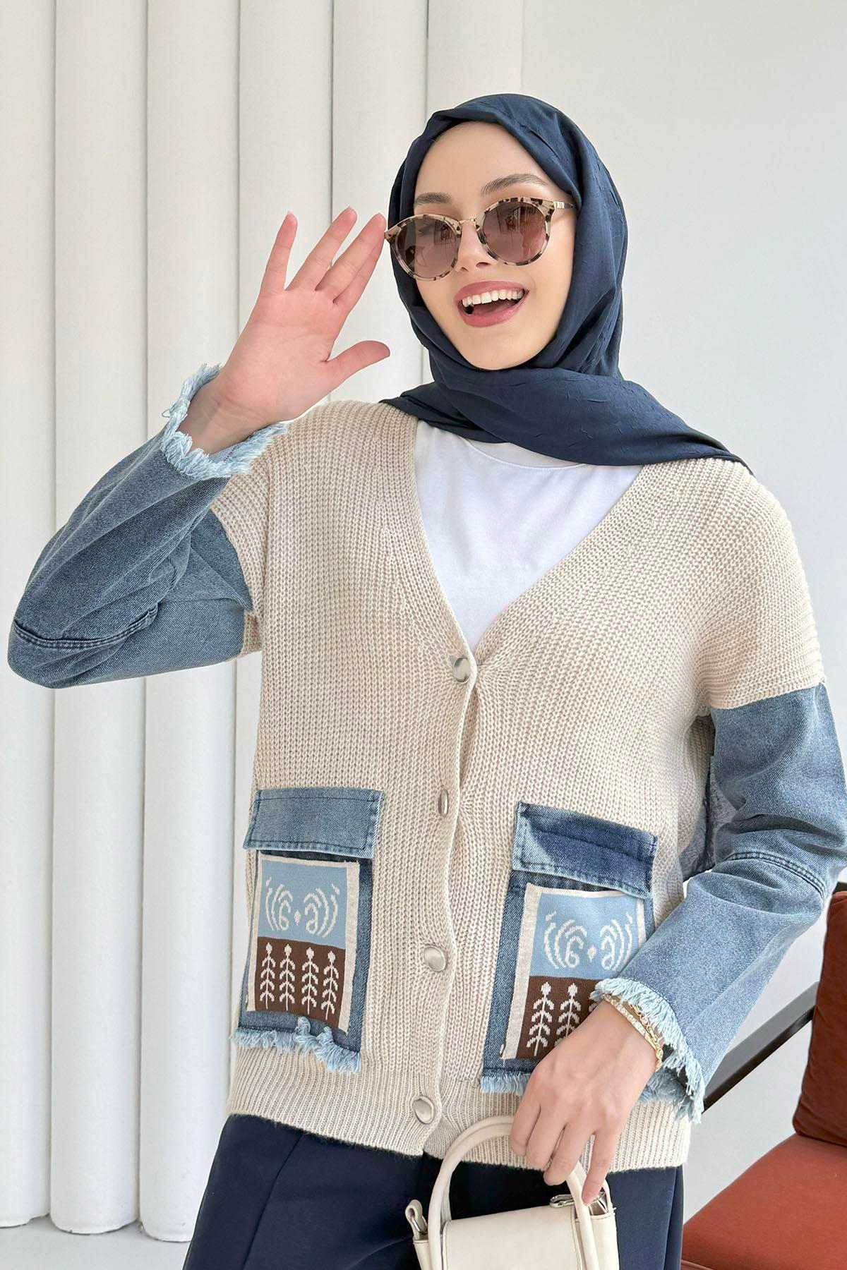 Cepler Desenli Kot Detaylı Triko Hırka-TAŞ (25726)