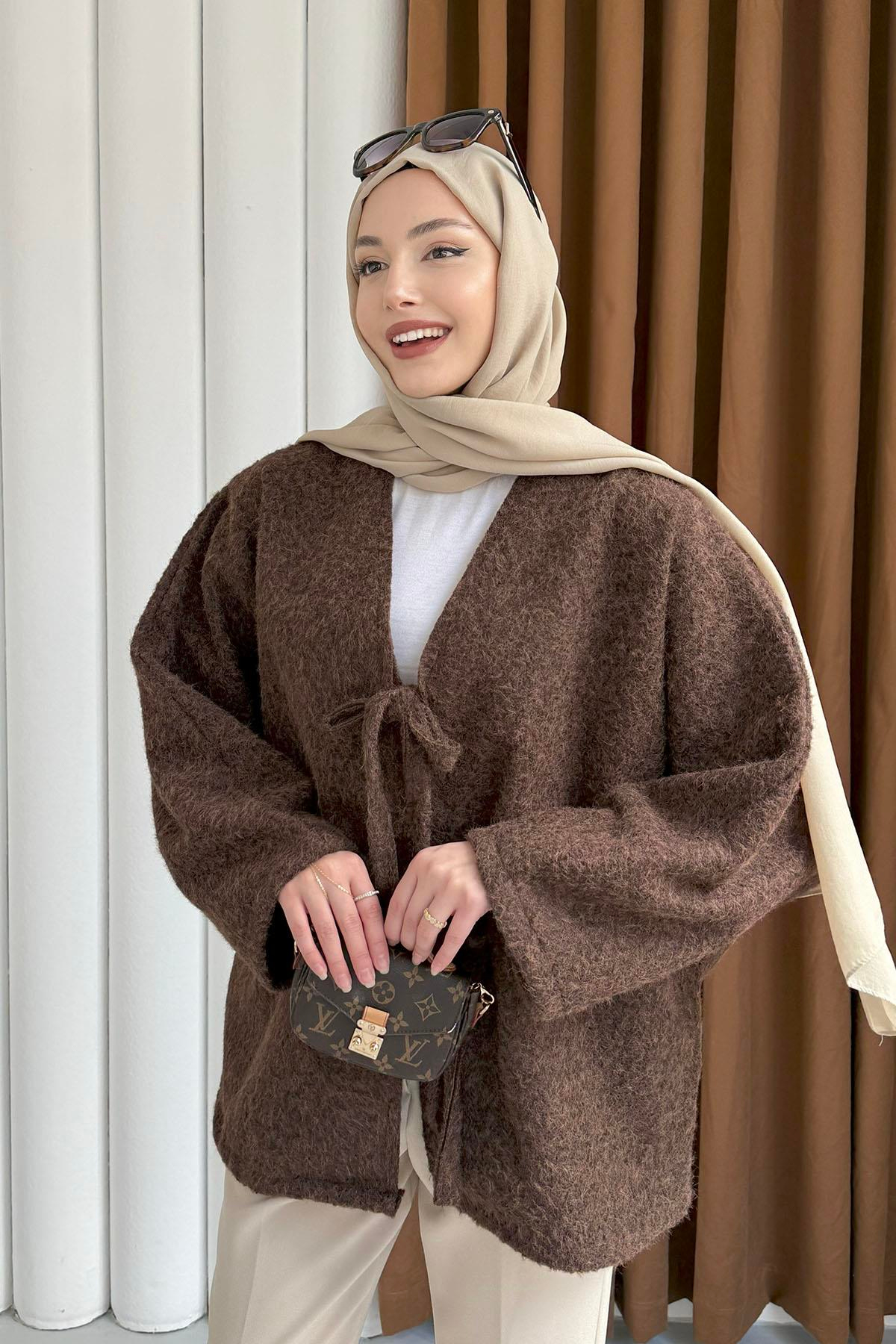 Çift Bağcık Detaylı Kırçıllı Kaşe Ceket-ACI KAHVE (8927)