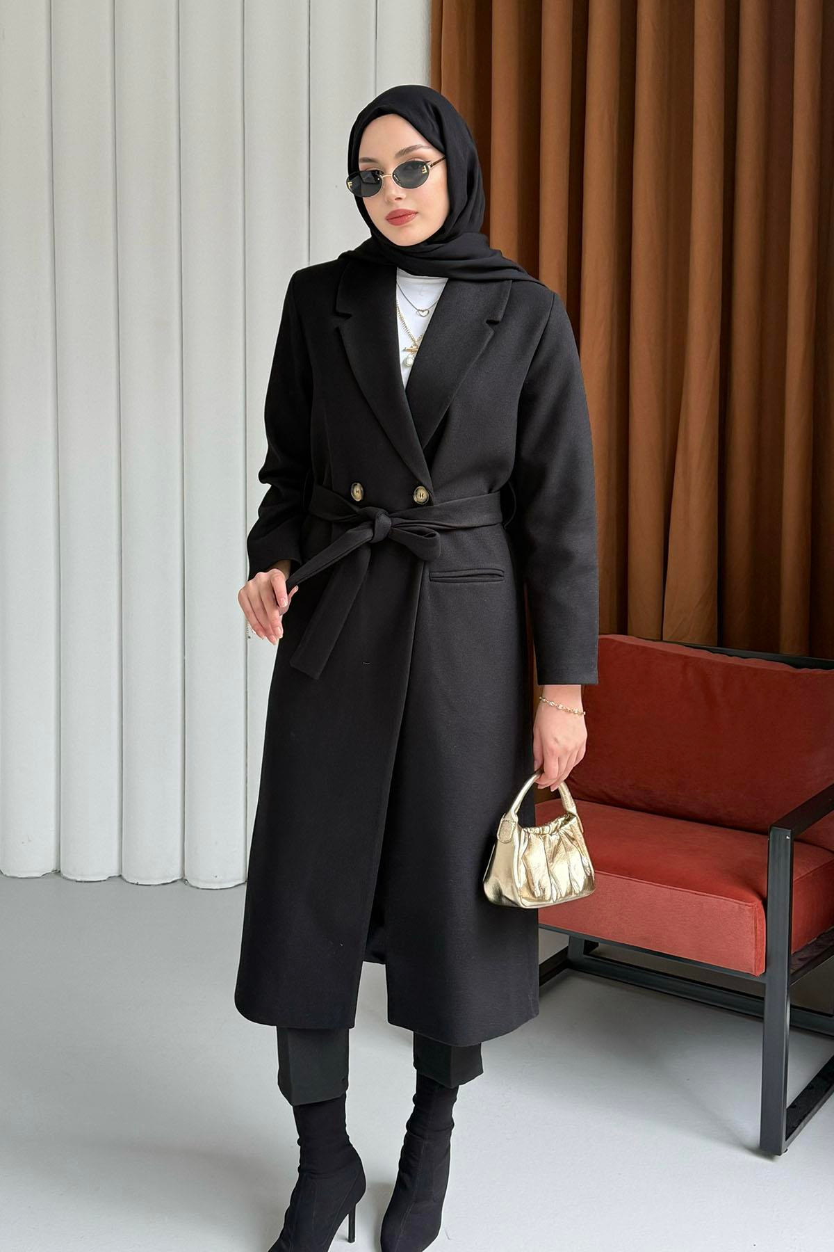 Çift Düğme Detaylı Kuşaklı Uzun Premium Kaşe Kaban-SİYAH (2902)