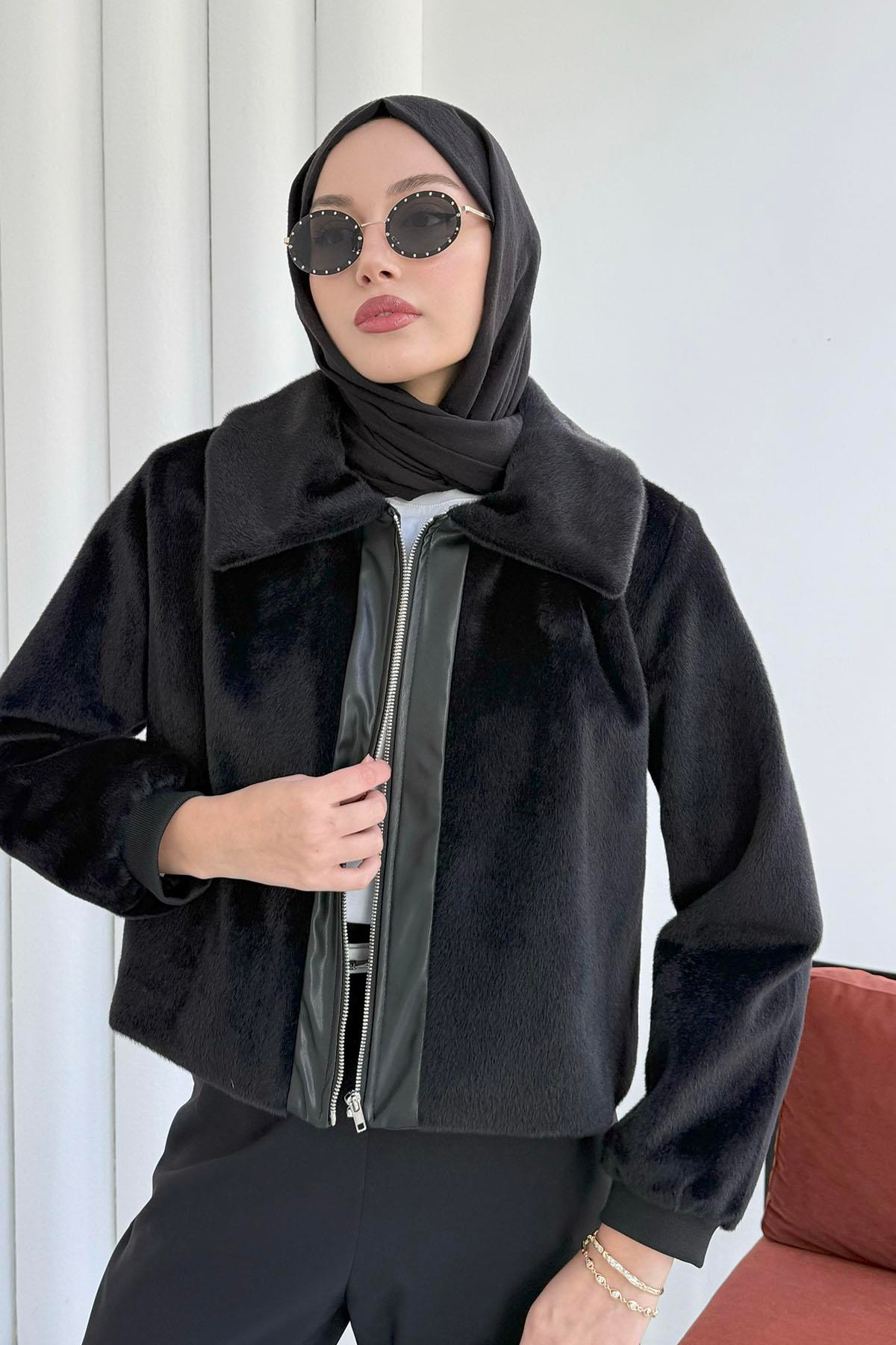 Çift Renk Kadife Dokulu Kısa Ceket-SİYAH (6970)