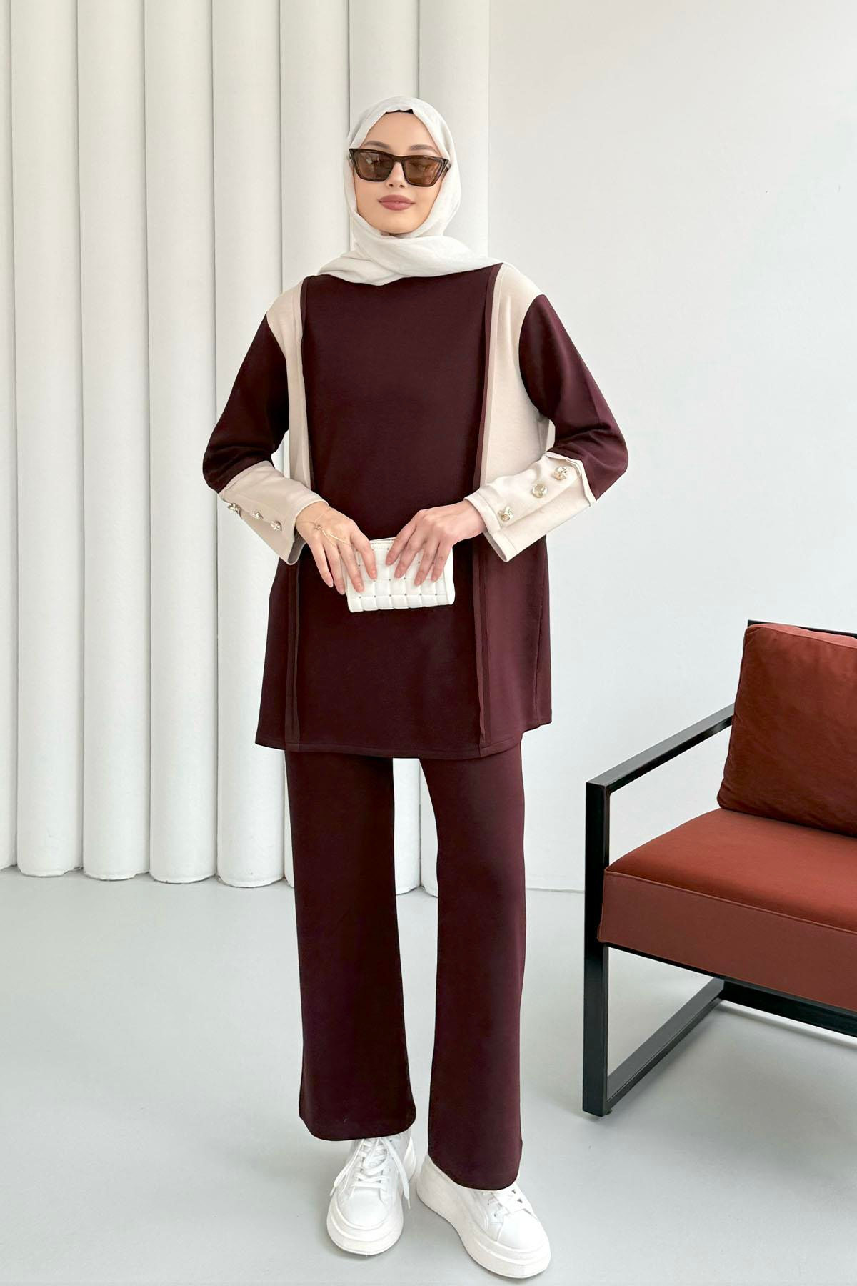 Çift Renkli Kol Düğme Detaylı Pantolonlu Tesettür Takım-BORDO (22774)