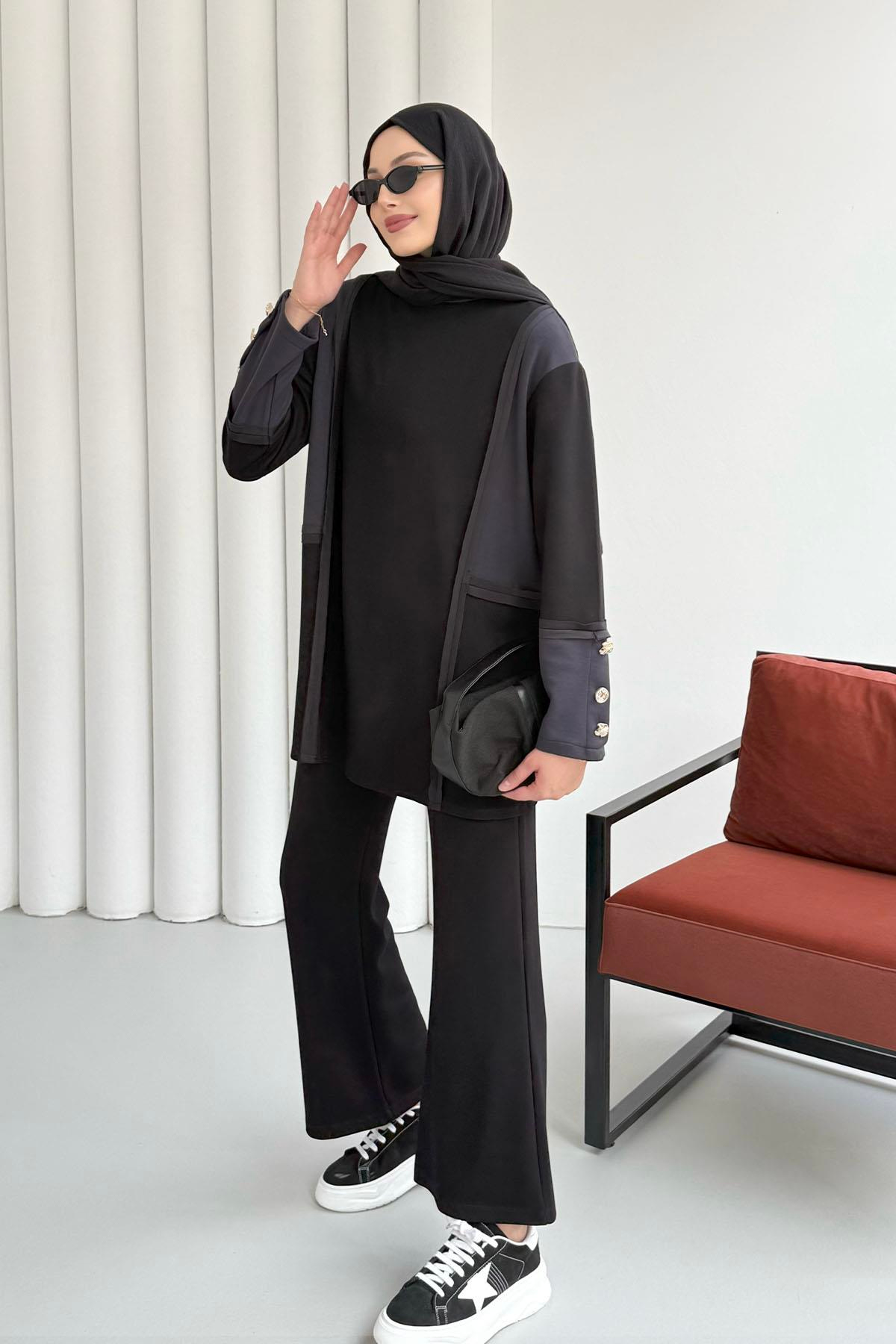 Çift Renkli Kol Düğme Detaylı Pantolonlu Tesettür Takım-SİYAH (22774)