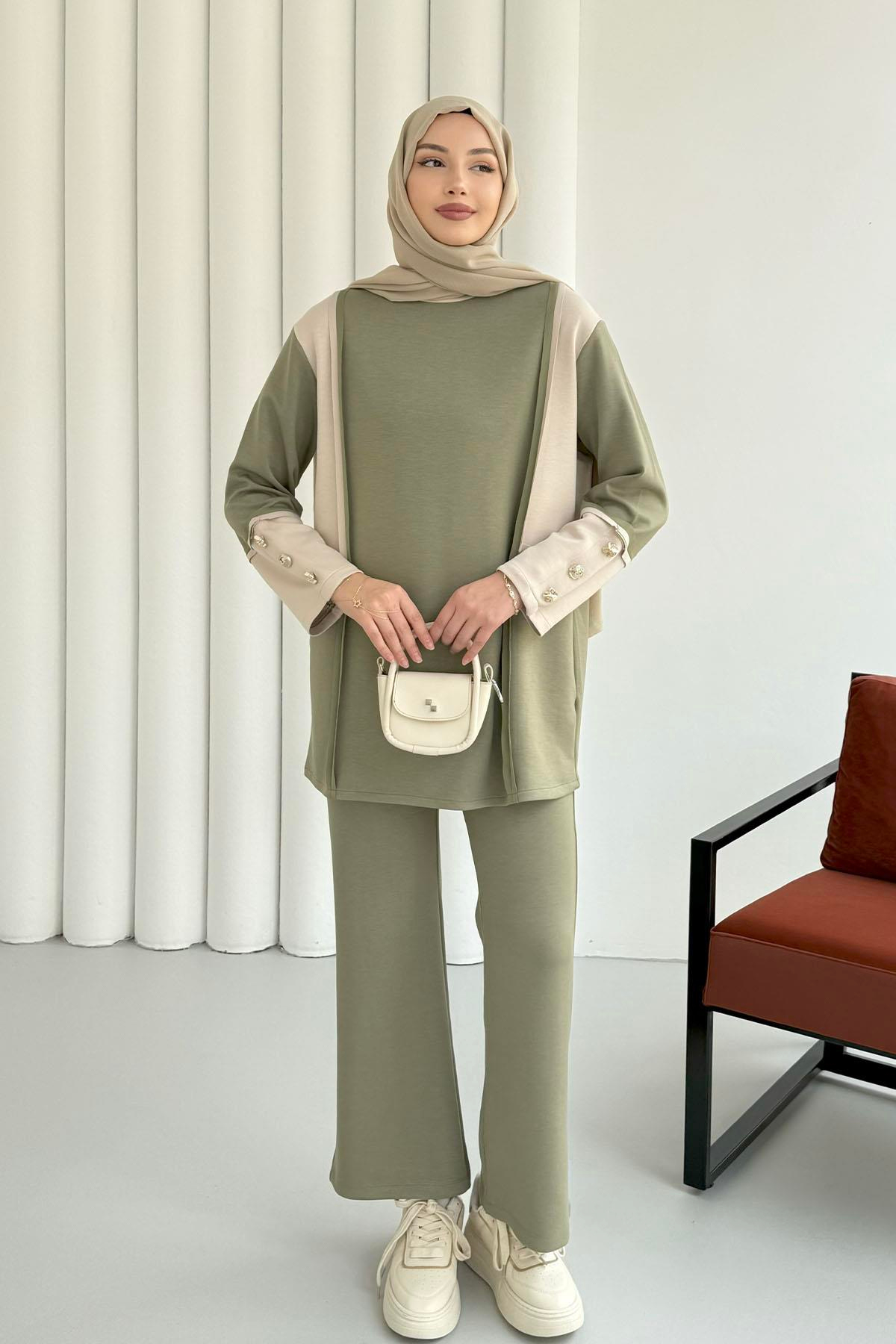 Çift Renkli Kol Düğme Detaylı Pantolonlu Tesettür Takım-YEŞİL (22774)