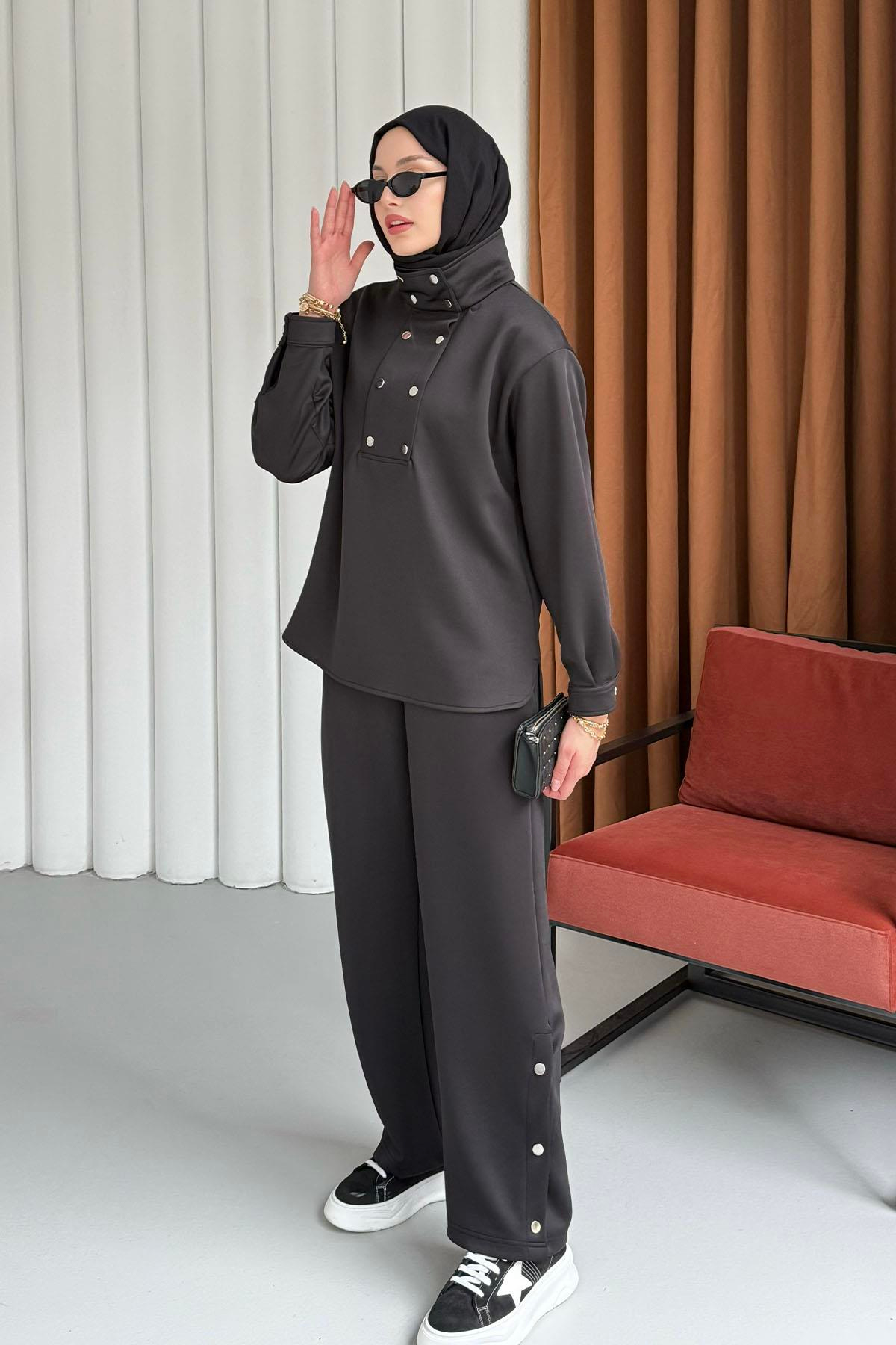 Çıt Çıt Detaylı Scuba Kumaş Tesettür Takım-SİYAH