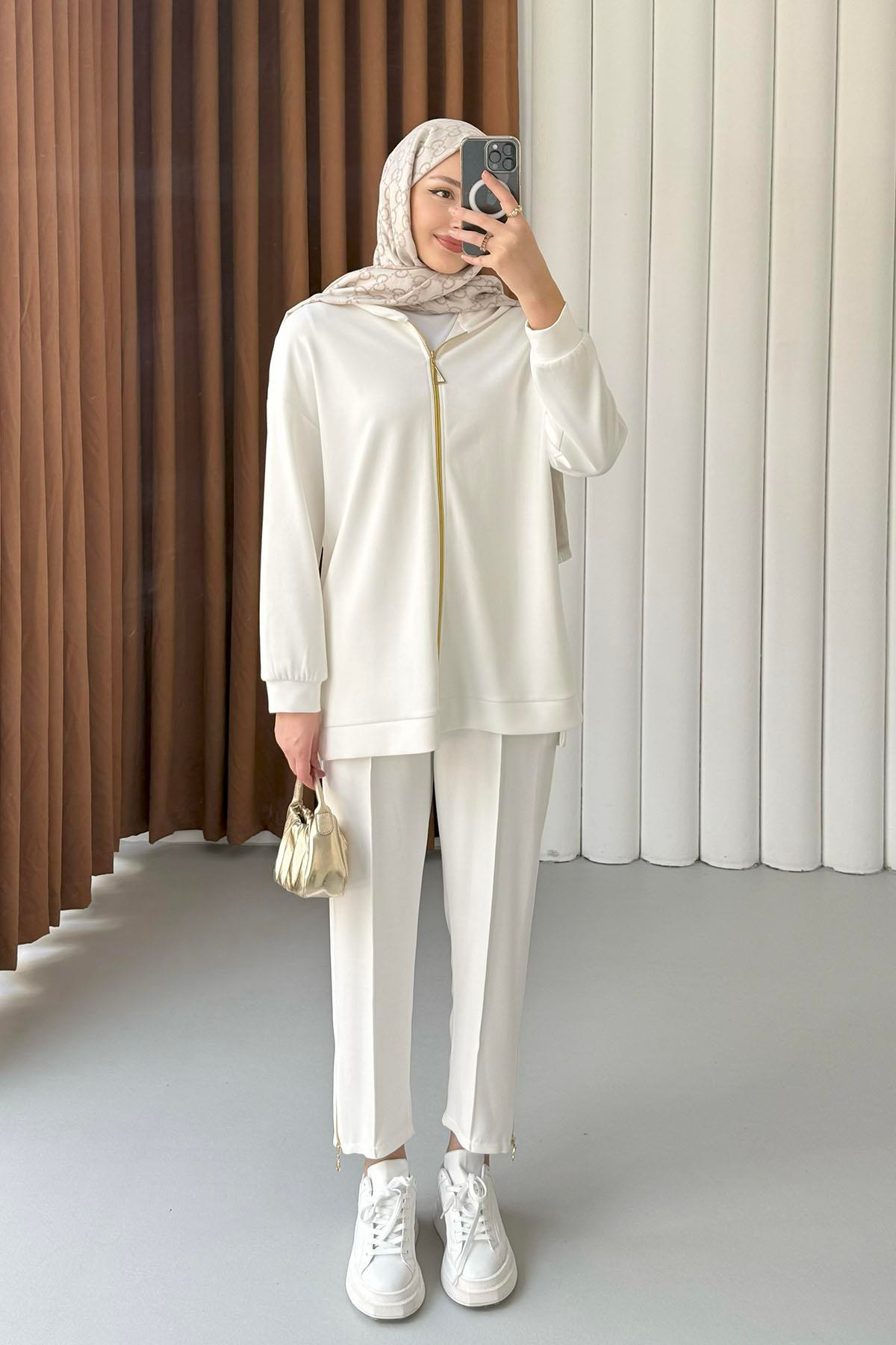 Fermuar Detaylı Oysho Kumaş Kapüşonlu Tesettür Takım-BEYAZ (22750)