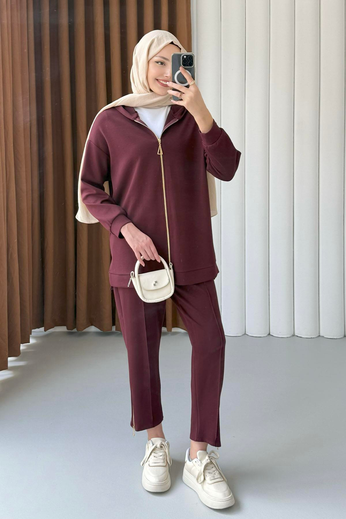 Fermuar Detaylı Oysho Kumaş Kapüşonlu Tesettür Takım-BORDO (22750)
