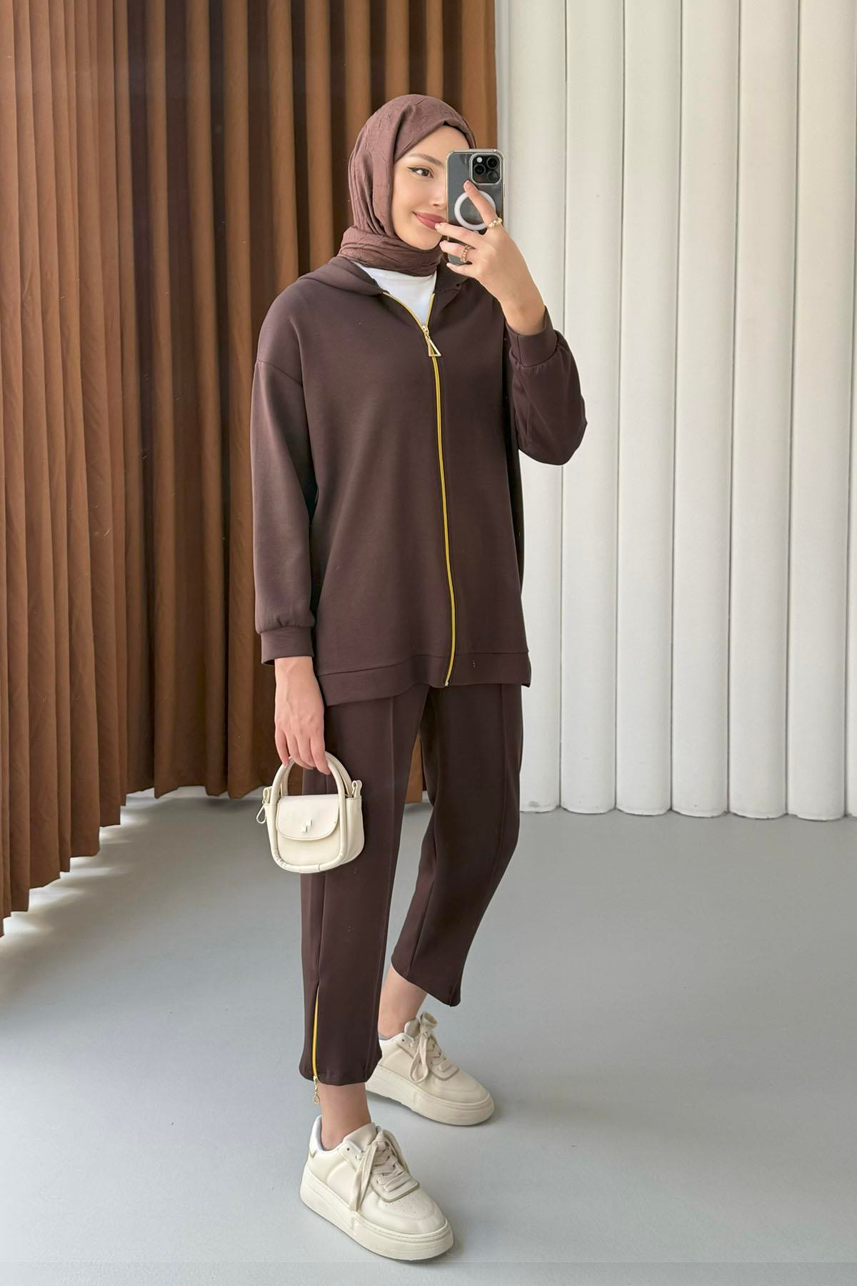 Fermuar Detaylı Oysho Kumaş Kapüşonlu Tesettür Takım-KAHVERENGİ (22750)