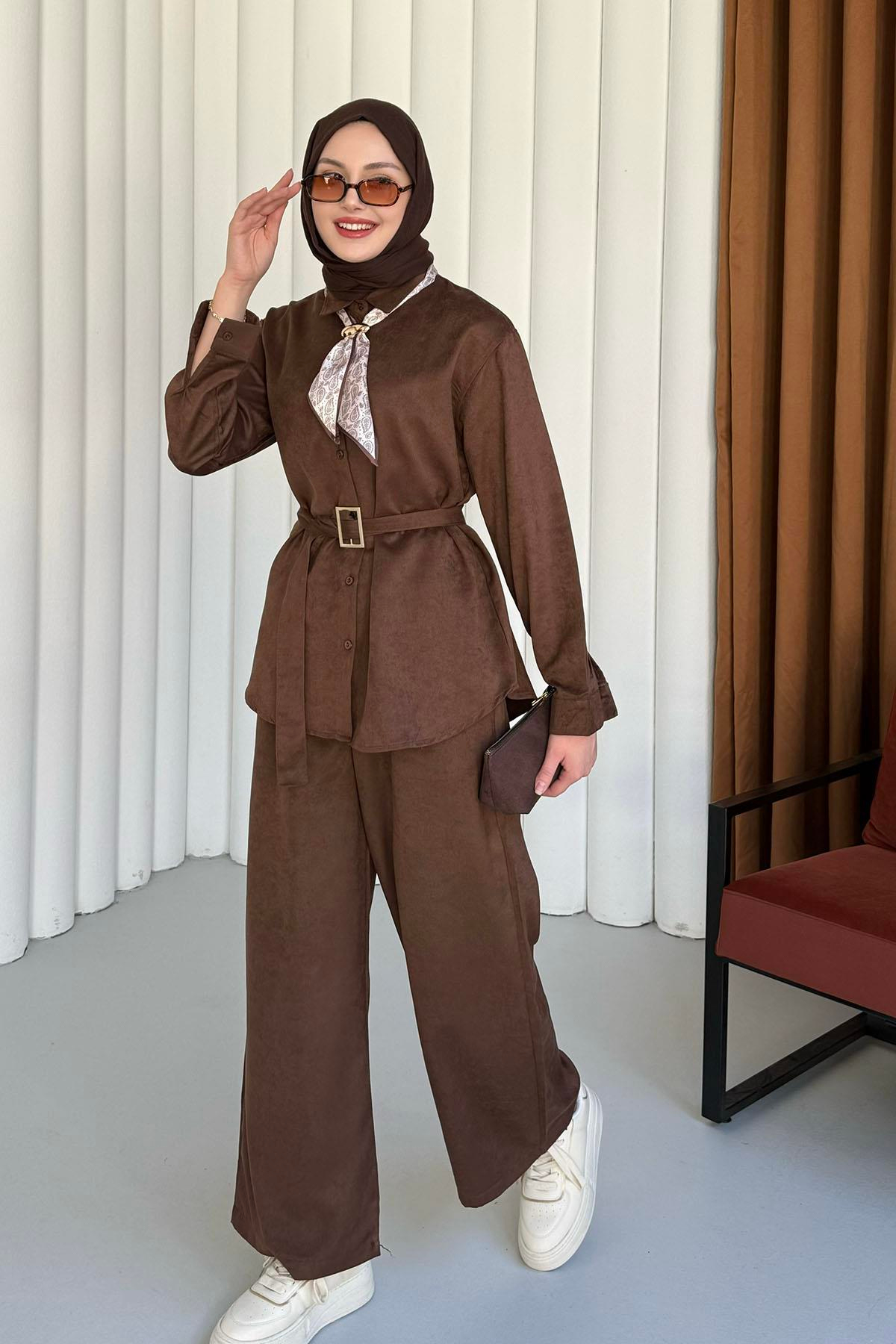 Fular Detaylı Süet Kumaş Gömlek Pantolon Tesettür Takım-KAHVERENGİ (8944)