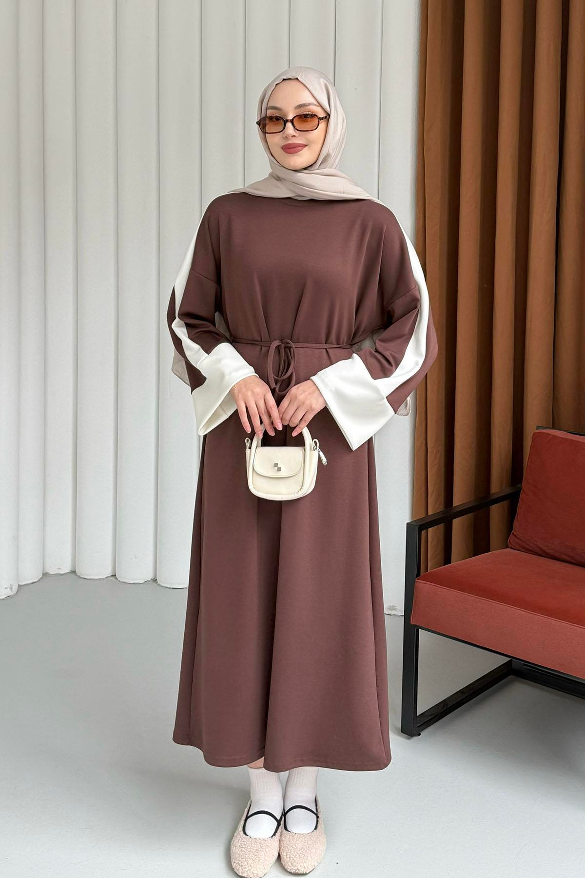 Garnili Oysho Kumaş Tesettür Elbise-KAHVERENGİ (5265)