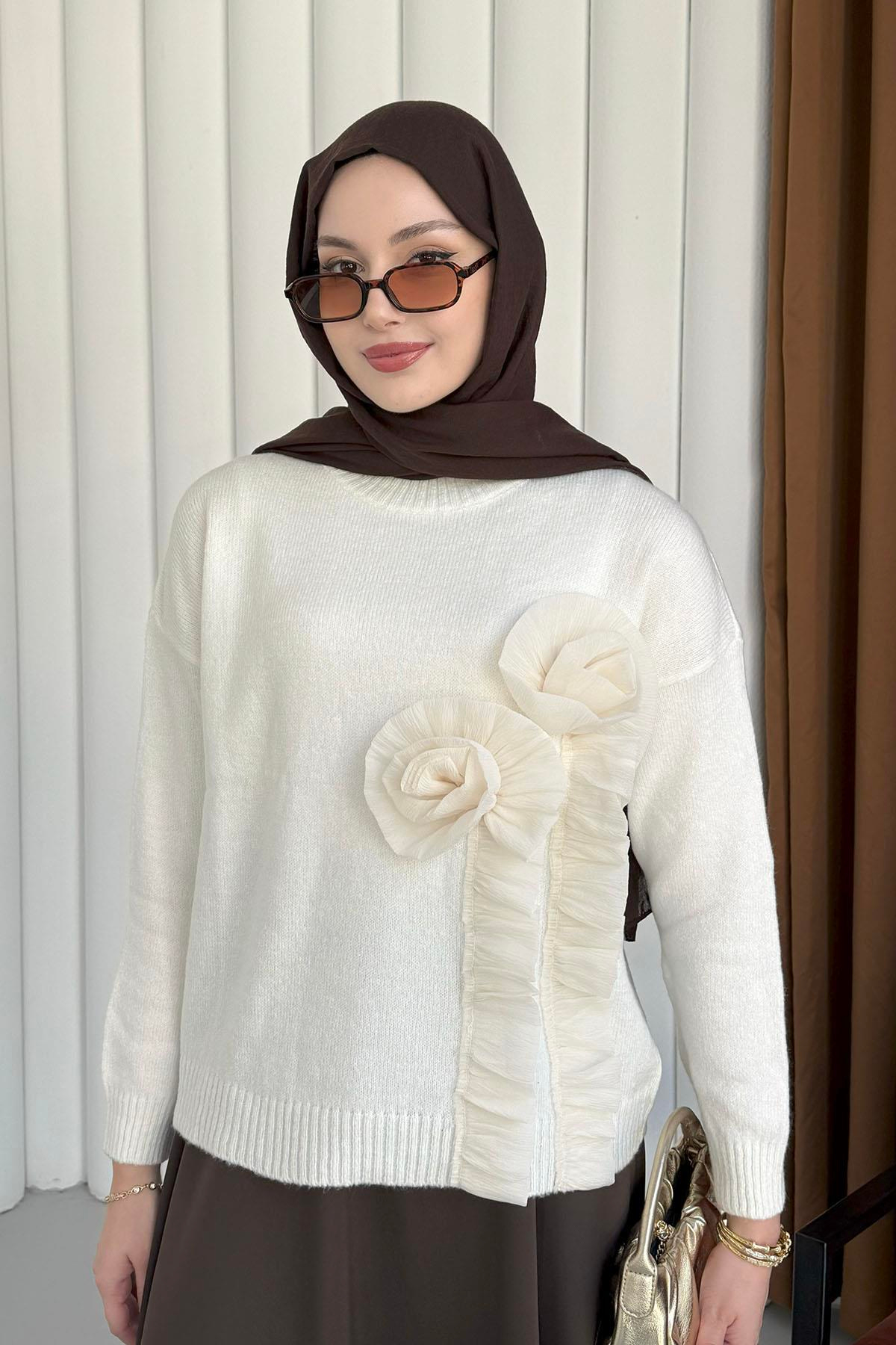 Gül Detaylı Triko Kazak-EKRU (1109)