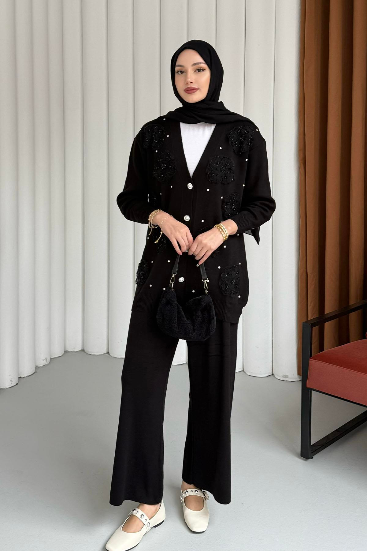 İnci Ve Çiçek Detay Hırkalı Tesettür Takım-SİYAH (3155)