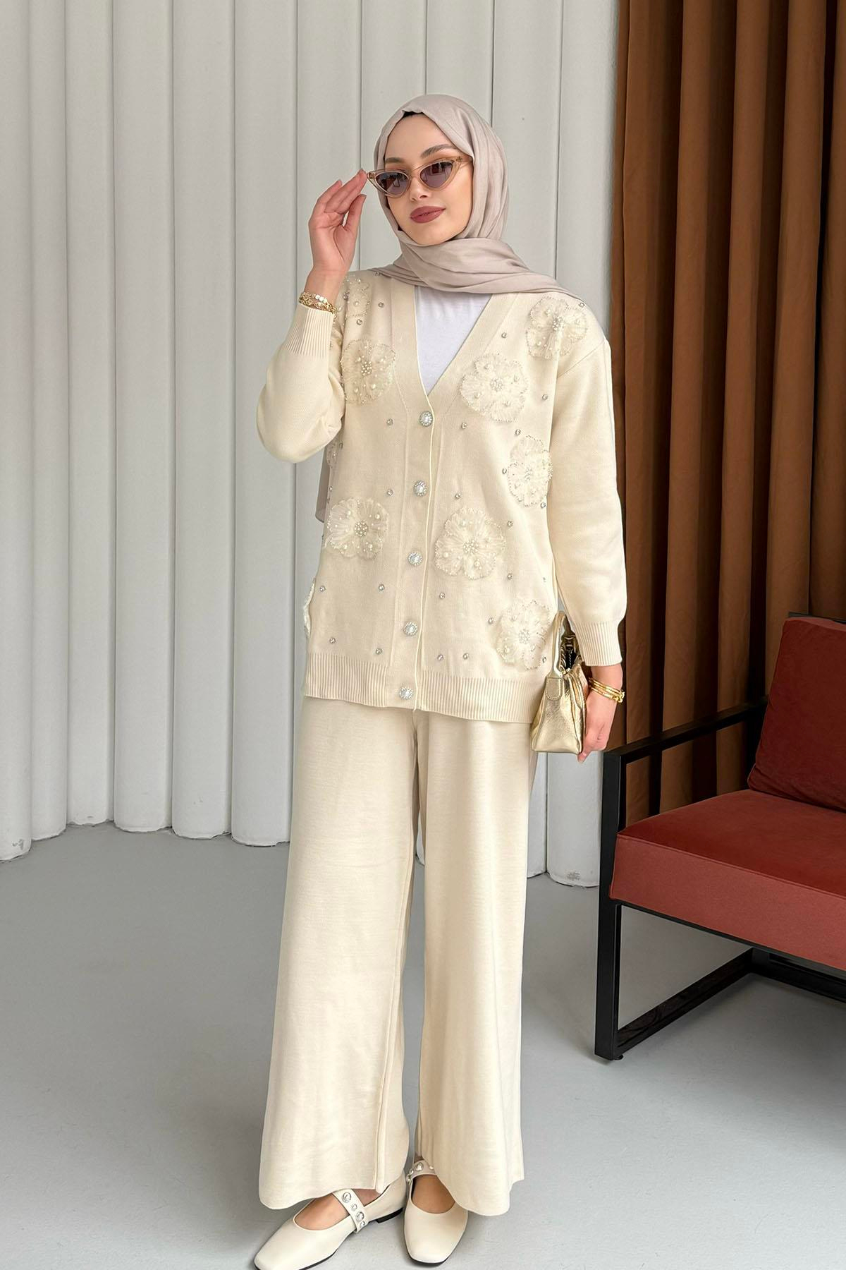 İnci Ve Çiçek Detay Hırkalı Tesettür Takım-TAŞ (3155)