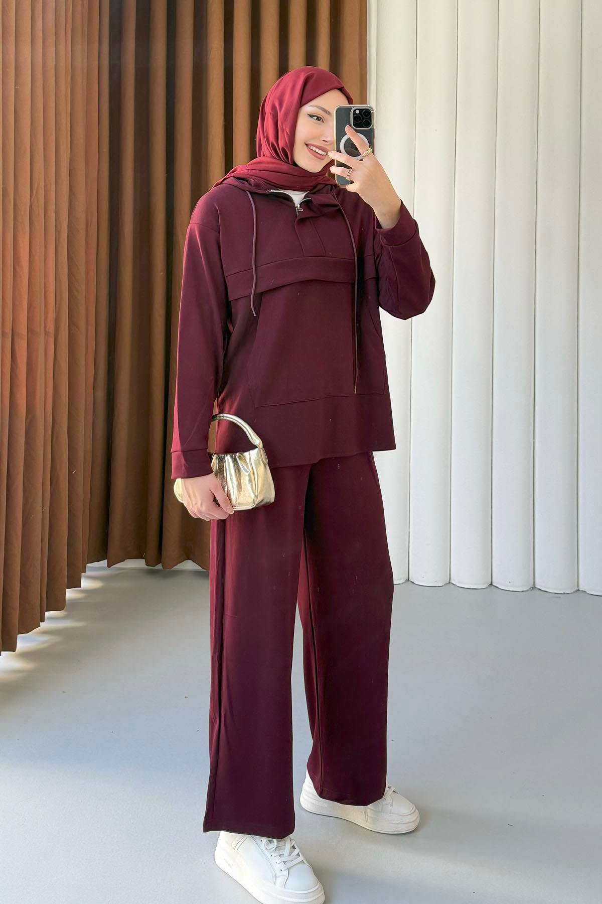 Kanguru Cepli Fermuarlı Pantolonlu Tesettür Takım-BORDO (3023)