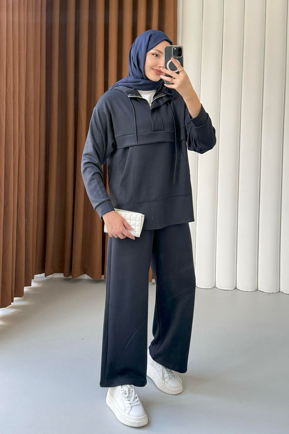 Kanguru Cepli Fermuarlı Pantolonlu Tesettür Takım-LACİVERT (3023)