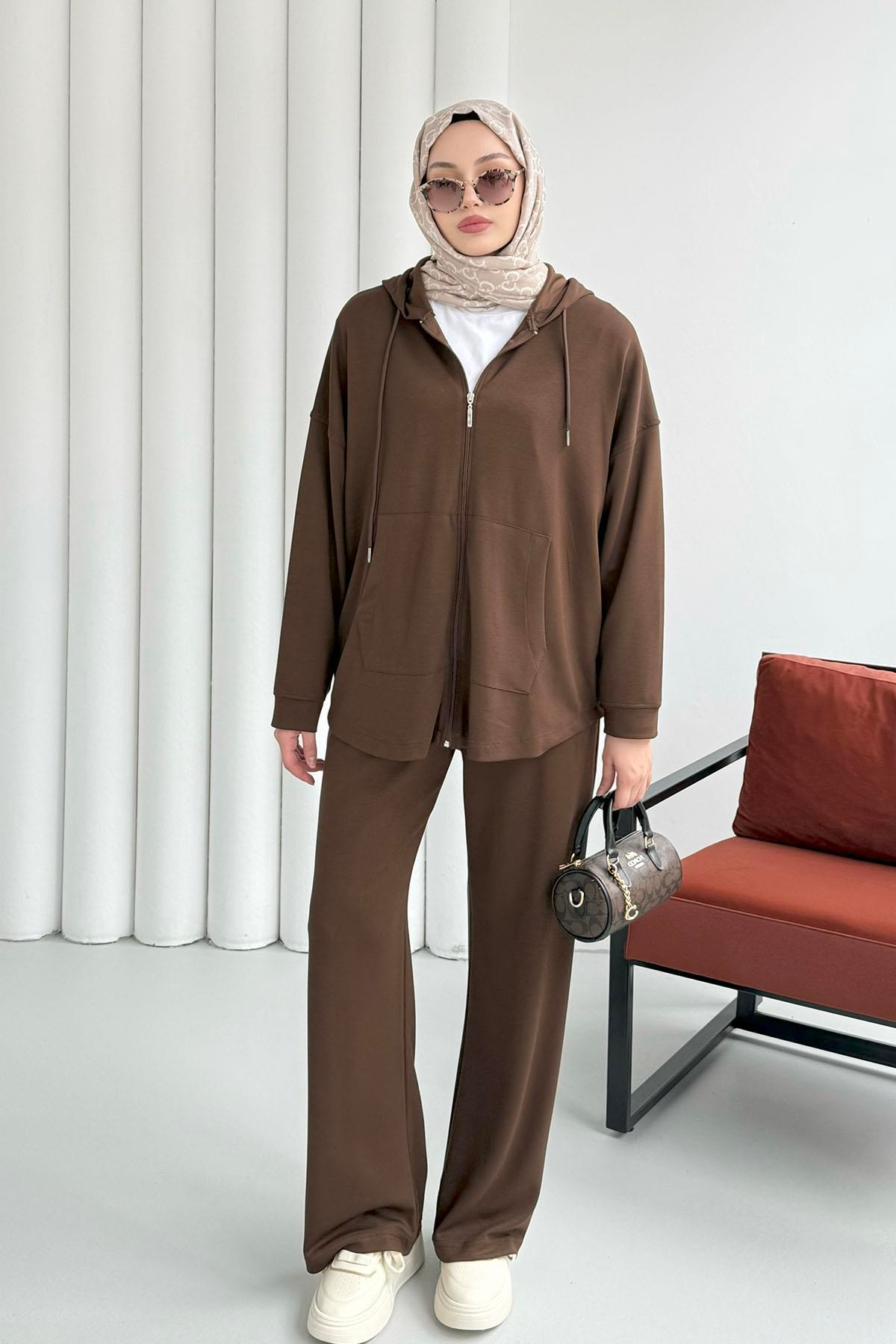 Kapüşonlu Oysho Kumaş Tesettür Takım-KAHVERENGİ (52805)