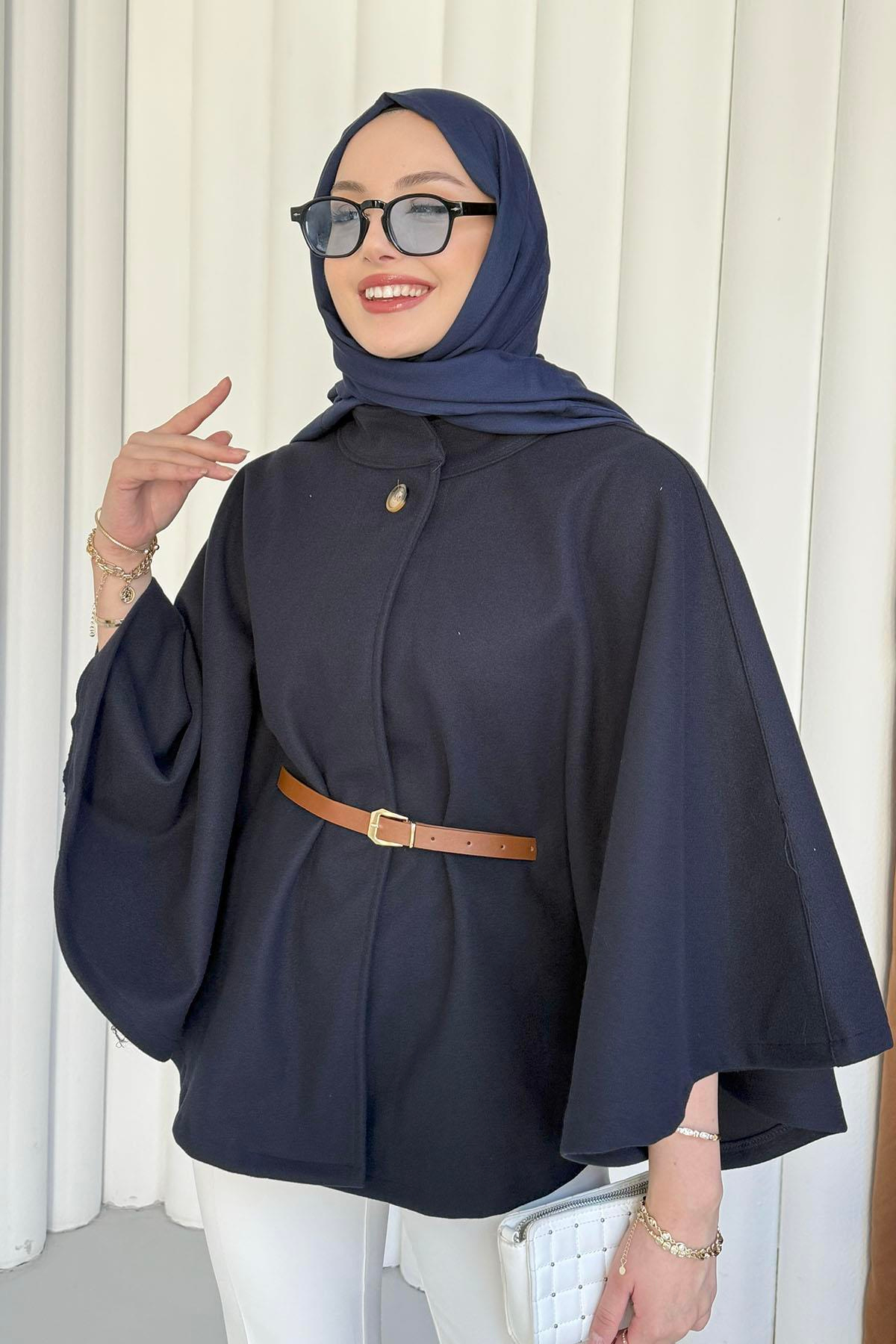 Kemer Detaylı Kaşmir Kumaş Panço-LACİVERT (8932)