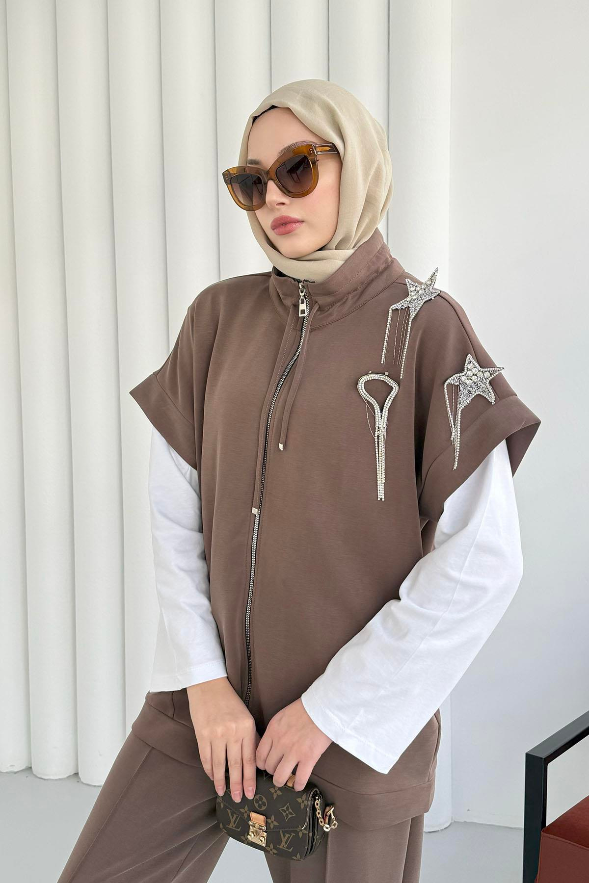 Kısa Kol Yıldız Aksesuarlı Bomber Yelek-KAHVERENGİ (24353)