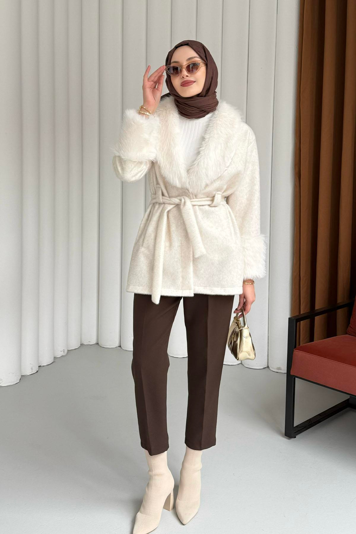Kol Ve Yaka Kürk Detaylı Kaban-EKRU (3032)