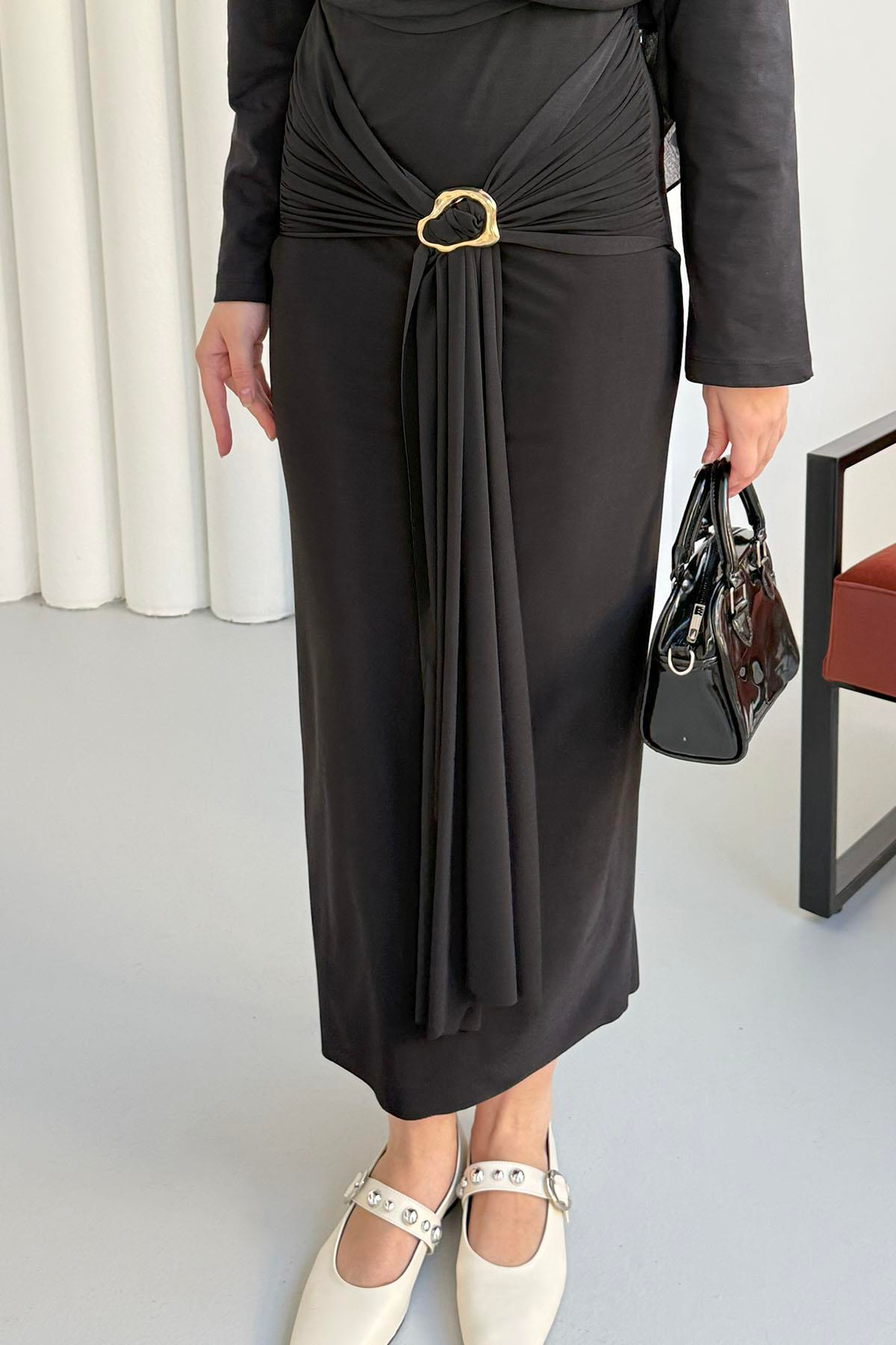 Kuşaklı Toka Detaylı Sendy Etek-SİYAH