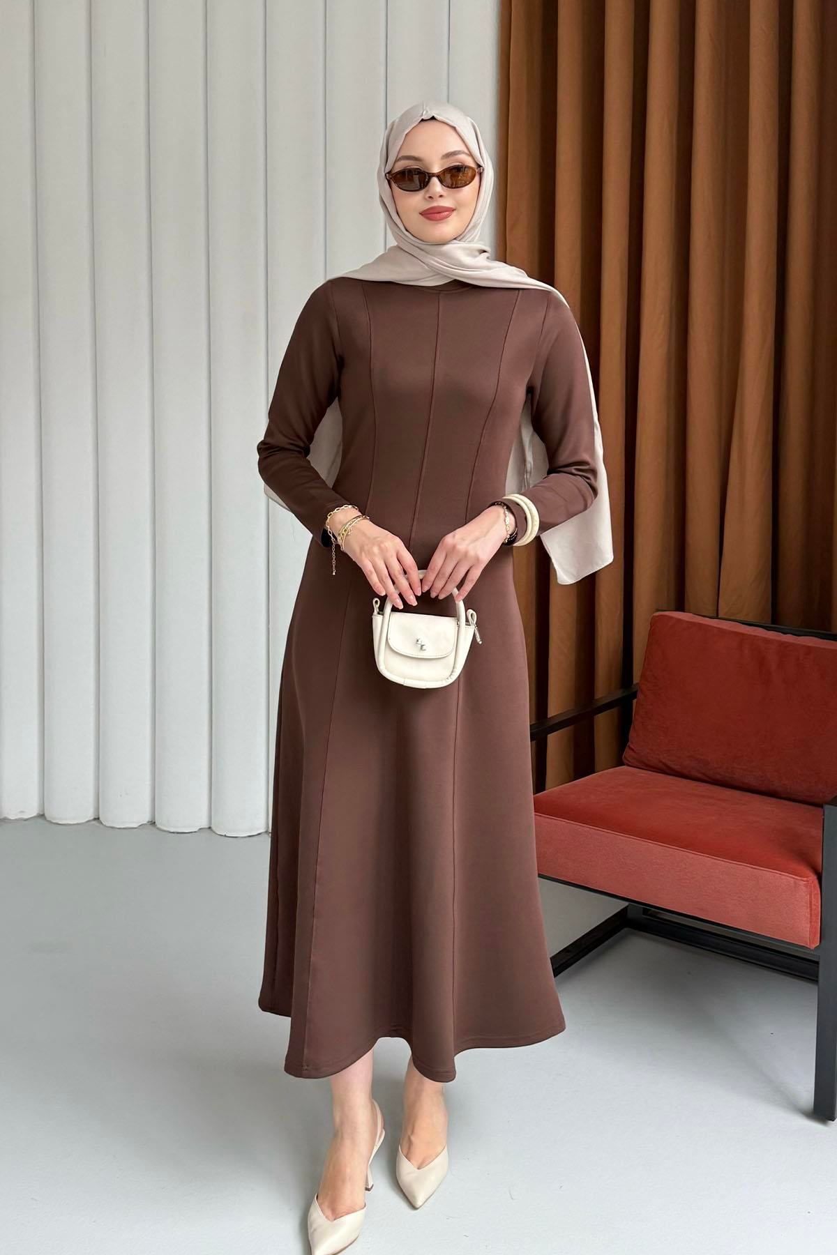 Nervür Dikişli Kiloş Tesettür Elbise-KAHVERENGİ (8933)