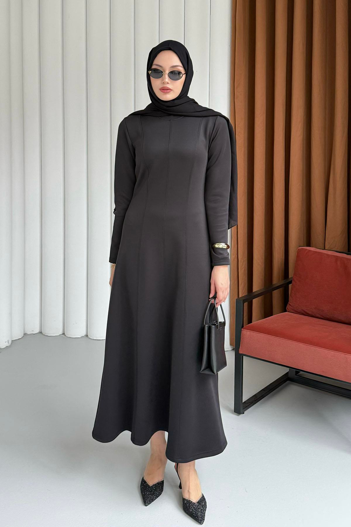 Nervür Dikişli Kiloş Tesettür Elbise-SİYAH