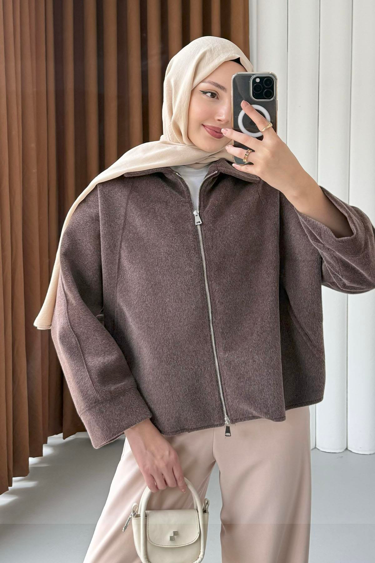 Ön Fermuarlı Yarasa Kol Detaylı Yün Kısa Mont-KAHVERENGİ (1215)
