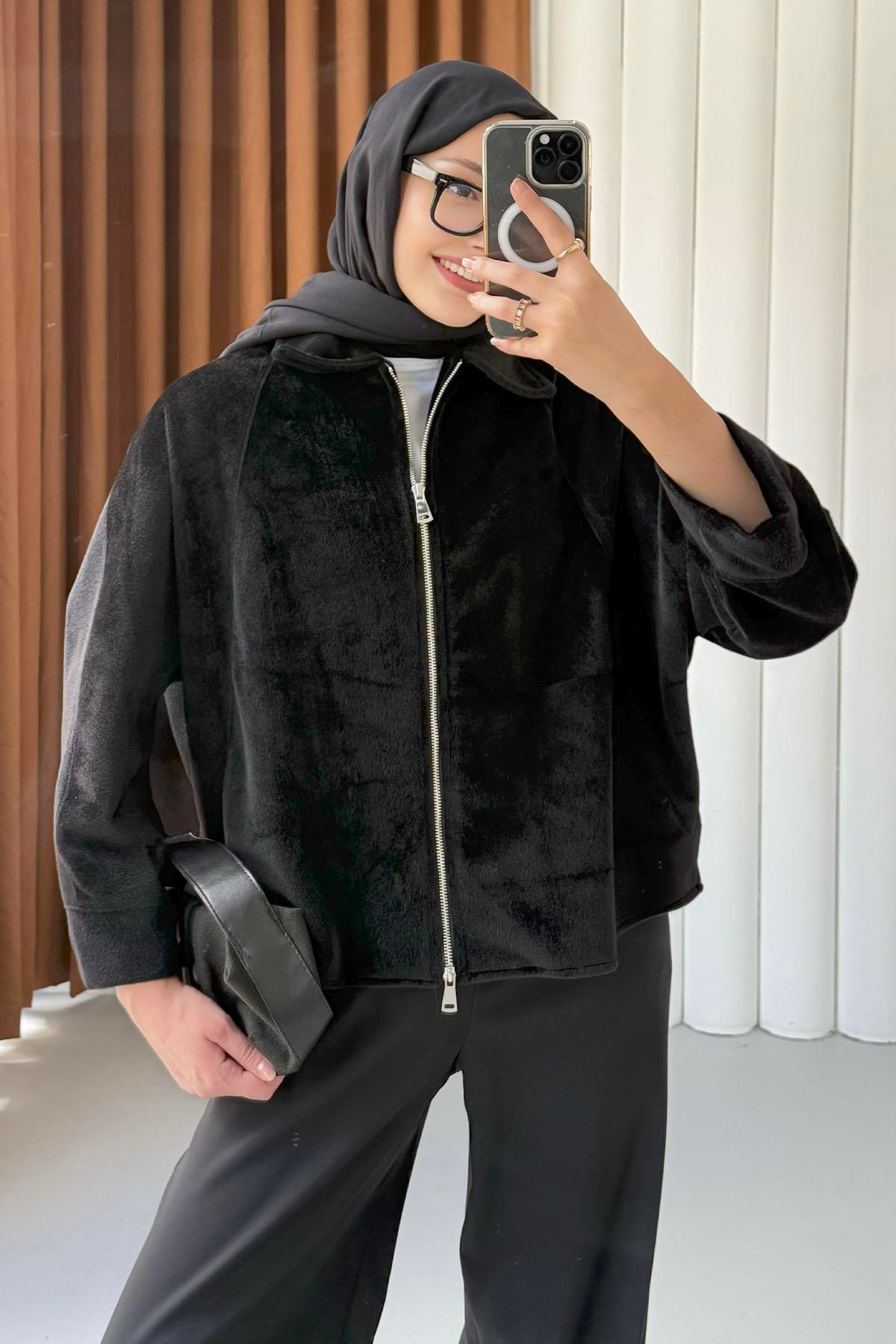 Ön Fermuarlı Yarasa Kol Detaylı Yün Kısa Mont-SİYAH (1215)