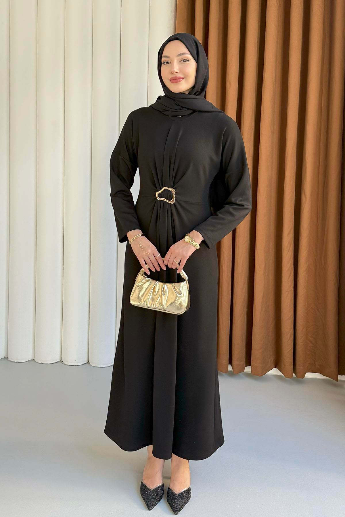 Ön Toka Detaylı Pileli Oysho Kumaş Tesettür Elbise-SİYAH (5253)