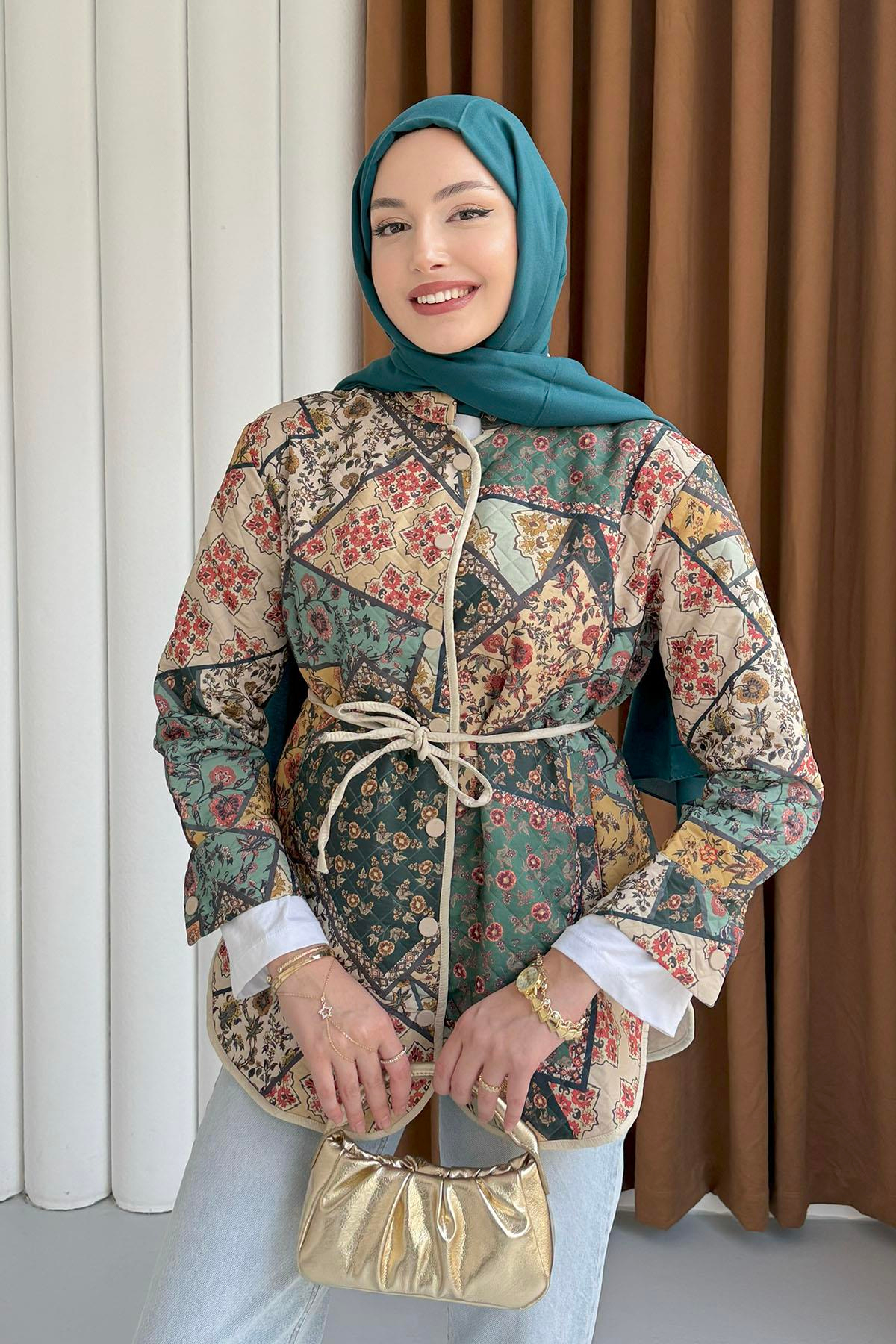 Önü Düğmeli Etnik Desenli Ceket-YEŞİL (24347)