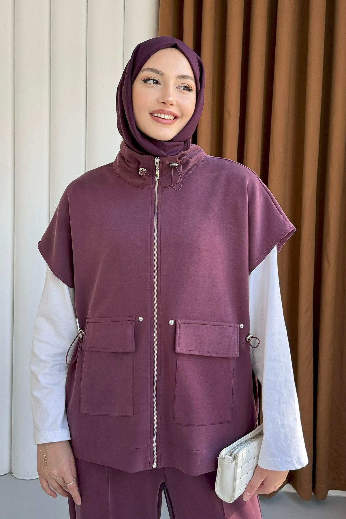 Önü Fermuarlı Belden Sıkmalı Oysho Kumaş Yelek-BORDO (24340)