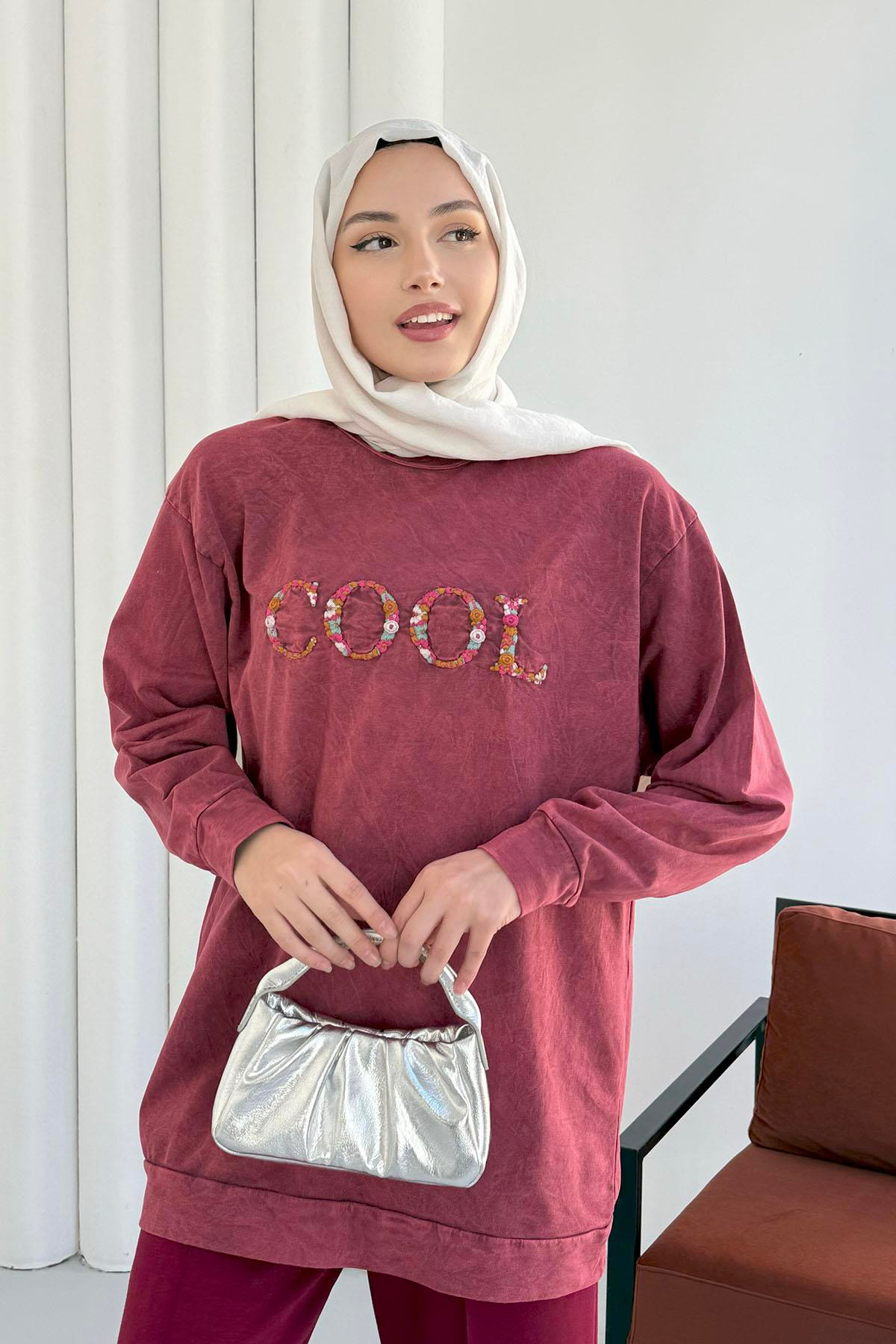 Önü Nakış Baskılı Yıkamalı Sweatshirt-BORDO (8920)
