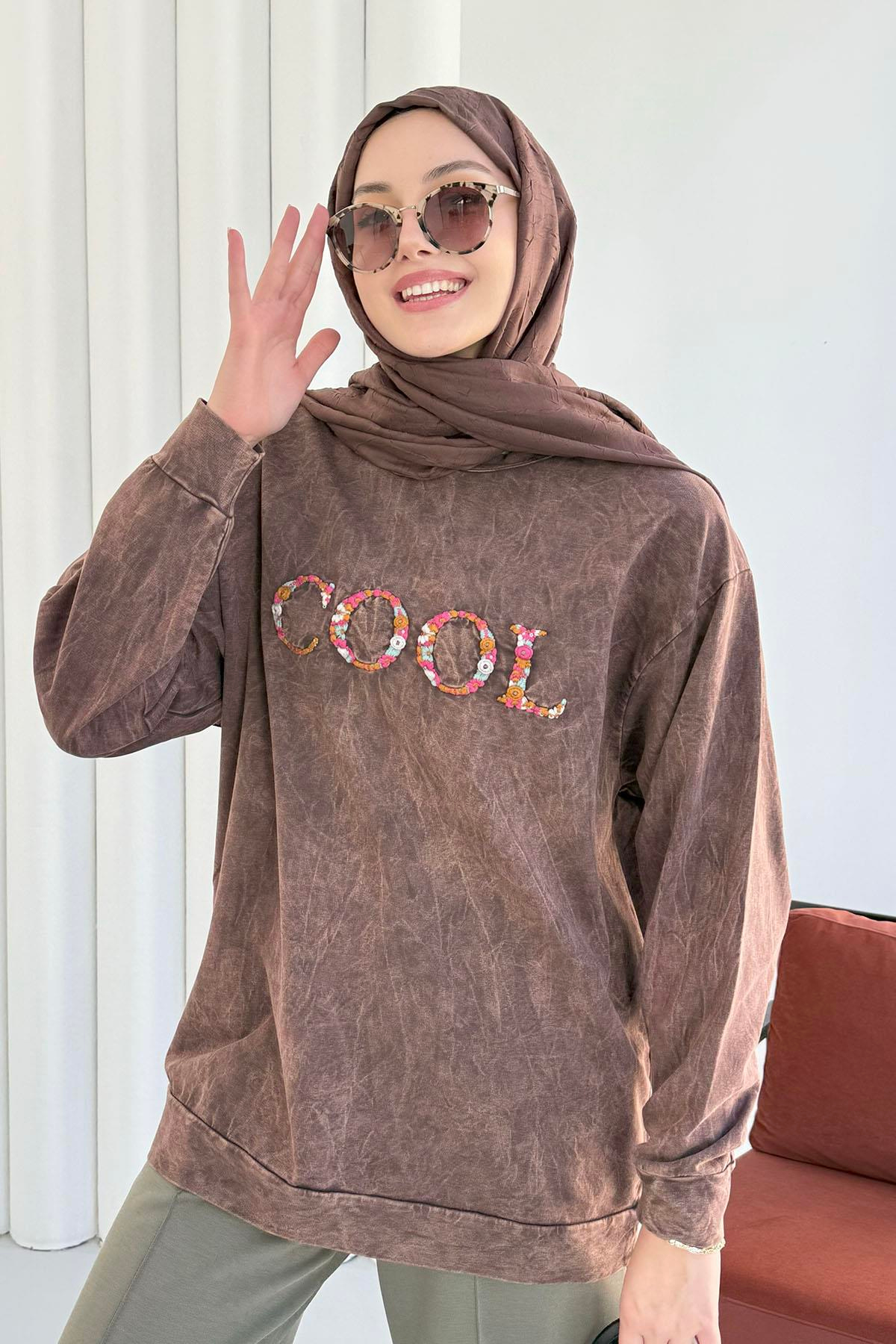 Önü Nakış Baskılı Yıkamalı Sweatshirt-KAHVERENGİ (8920)