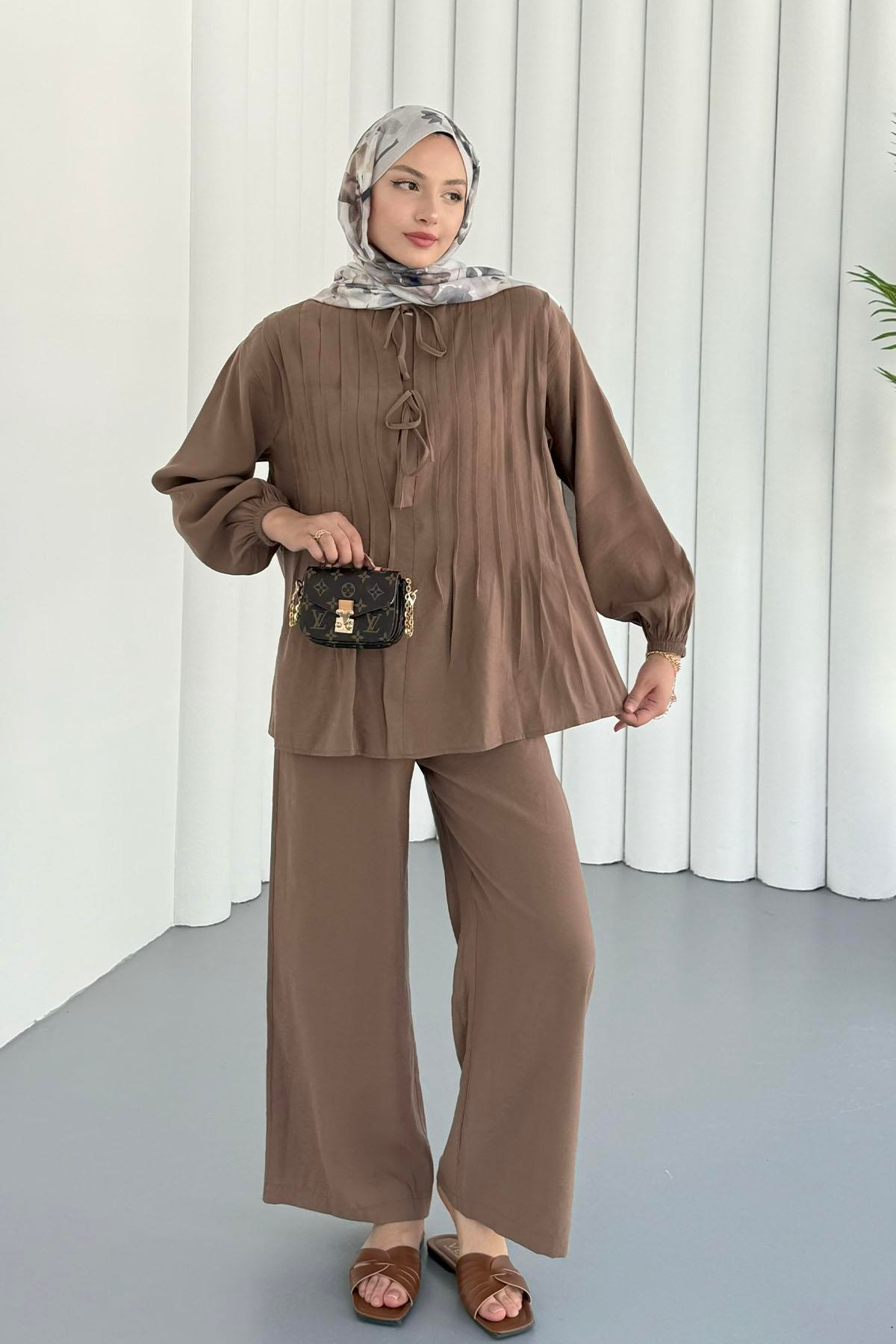 Önü Pileli Yakası Bağçık Detay Tesettür Takım-KAHVERENGİ (8392)