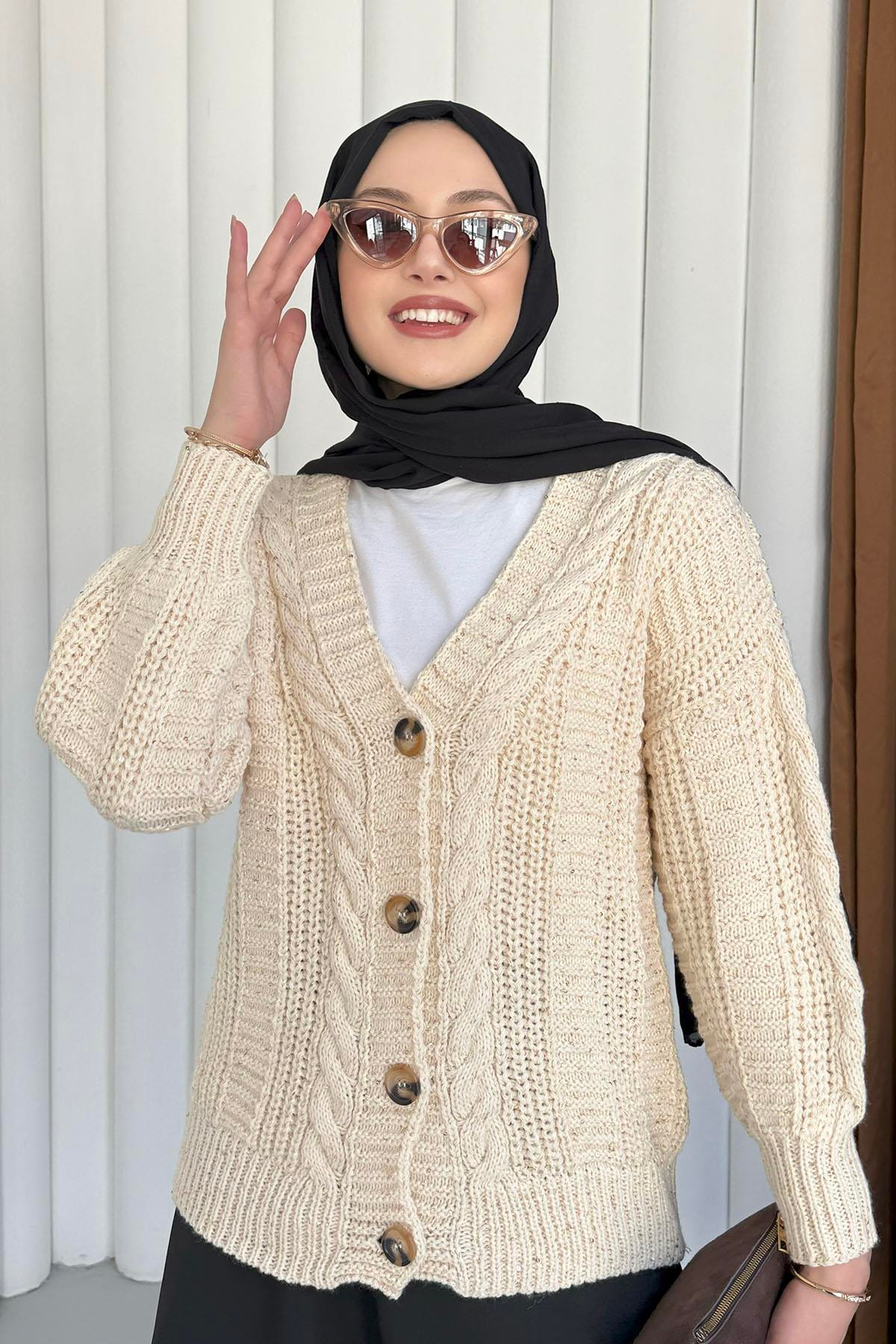 Örgü Detaylı Dört Düğmeli Balon Kol Triko Hırka-EKRU (1157)
