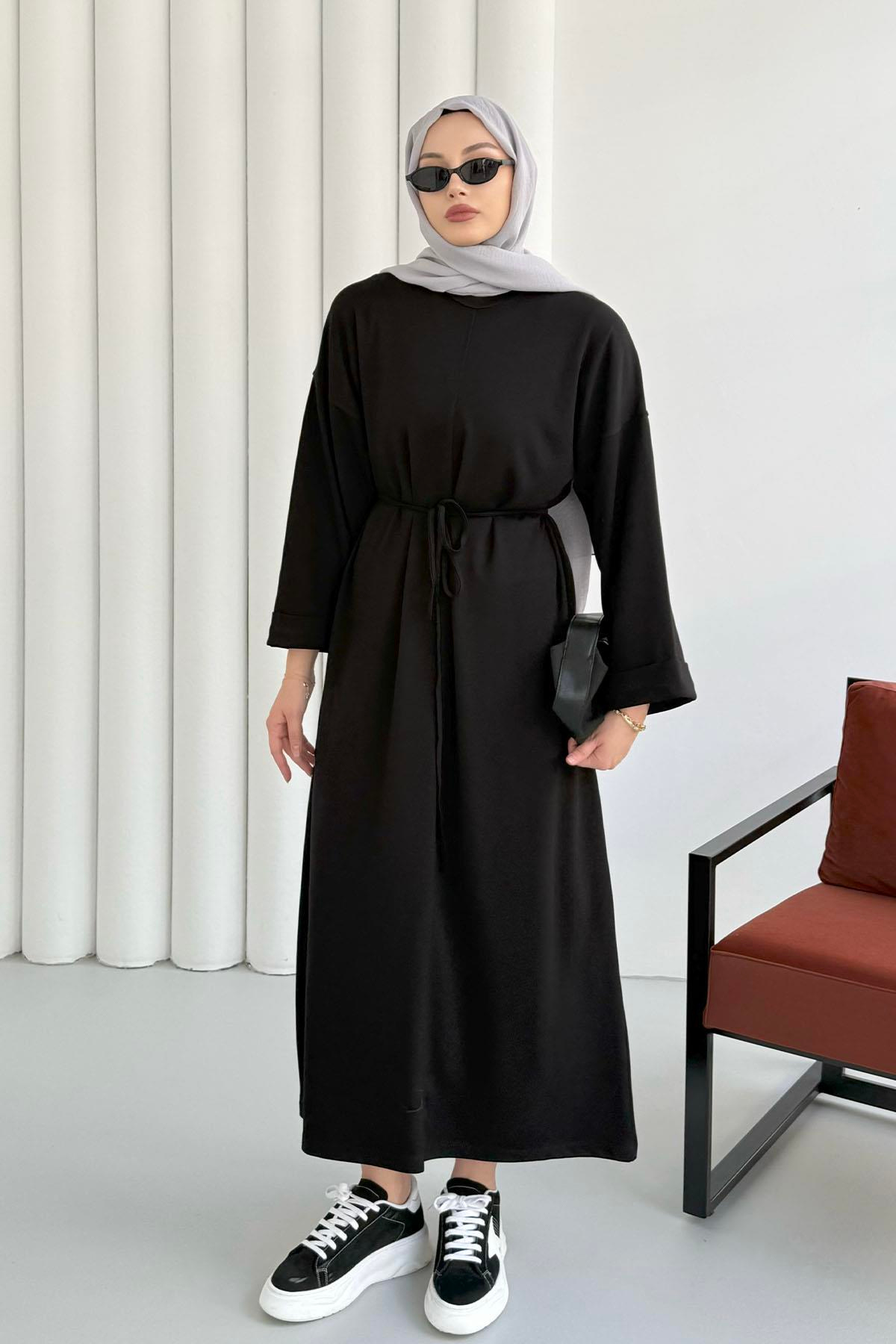 Oysho Kumaş Biye Kemerli Tesettür Elbise-SİYAH (8904)
