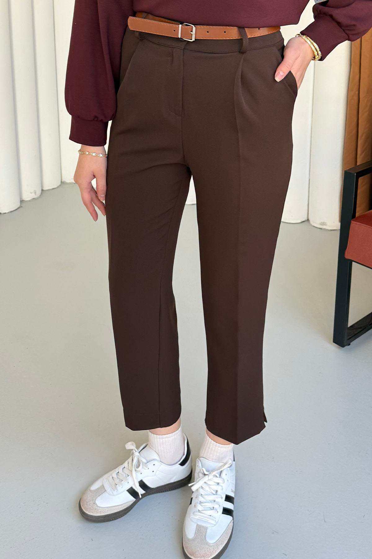 Paça Yırtmaçlı Kemer Detaylı Pantolon-KAHVERENGİ (4025)