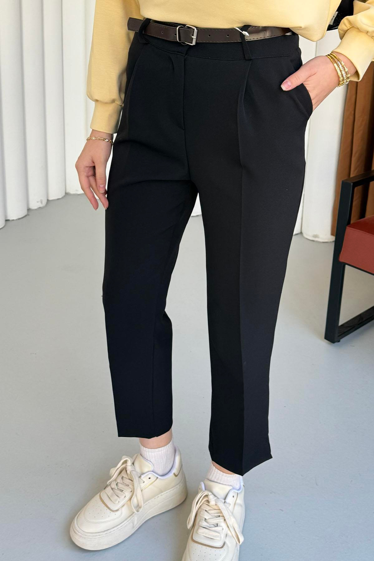 Paça Yırtmaçlı Kemer Detaylı Pantolon-SİYAH (4025)