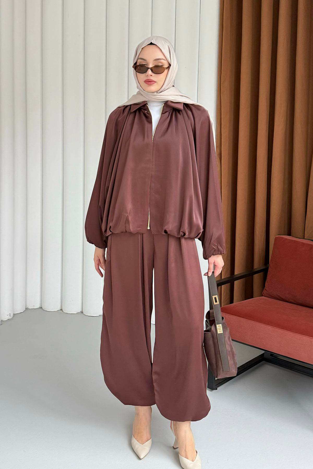 Premium Saten Kumaş Bomber Ceket Pantolon Tesettür Takım-KAHVERENGİ (3015)
