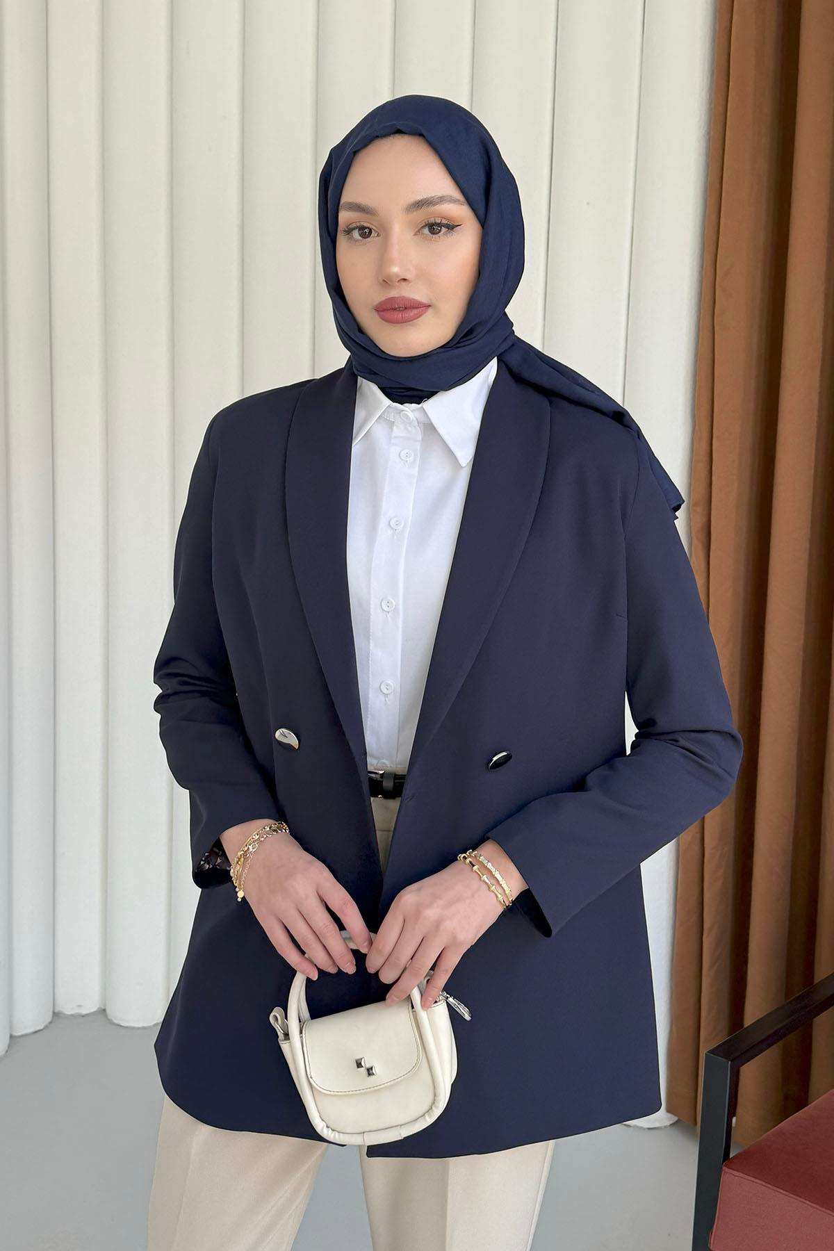 Şal Yaka Astarı Leopar Kruvaze Yaka Ceket-LACİVERT (1156)